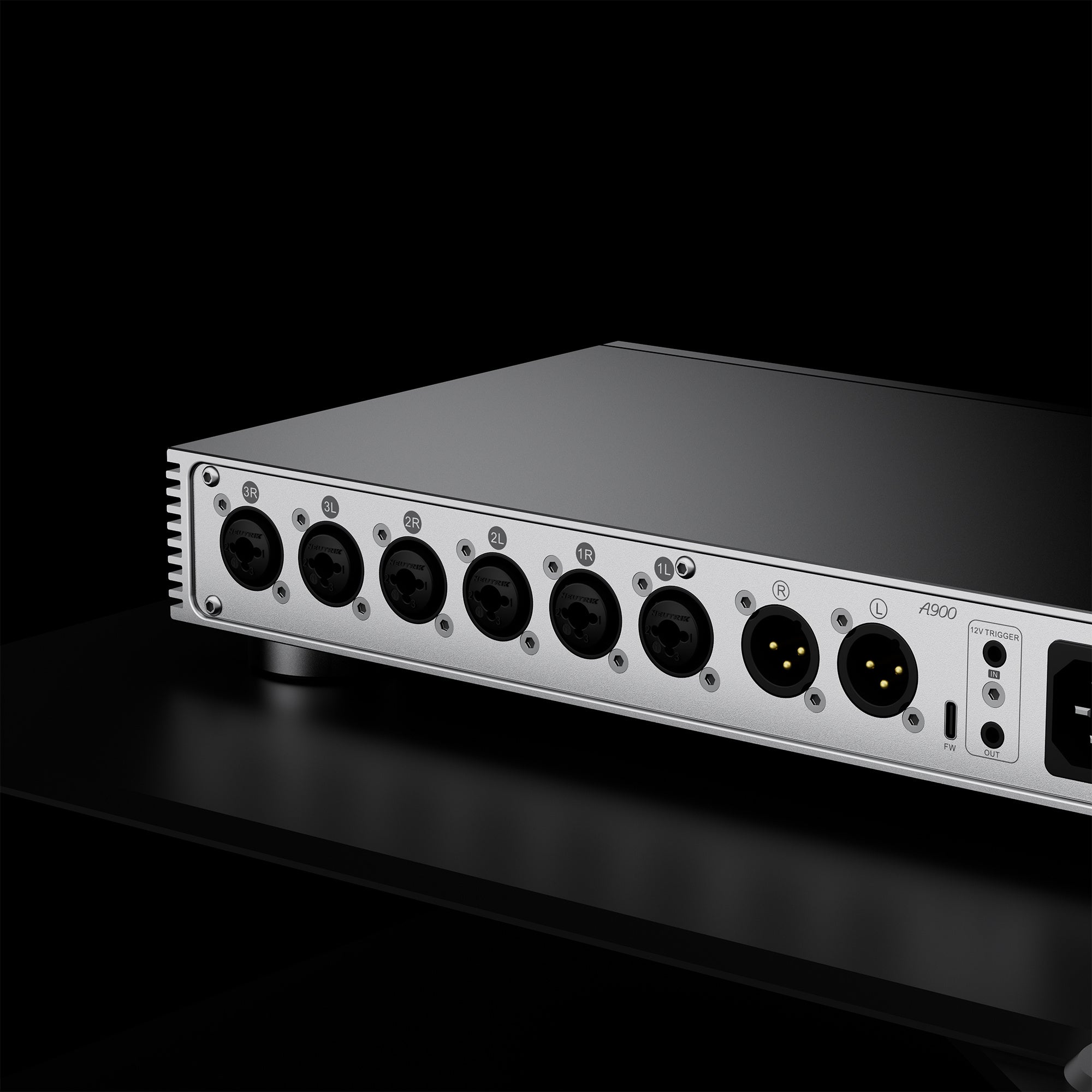 A900のフロント部には6つの物理ポートを備えたフルレンジのヘッドフォン出力を搭載し、6.35mmシングルエンド、4.4mmバランス、4pin XLRバランス、デュアル3pin XLRバランス出力を備えることで主流なヘッドホンの接続規格をフルでサポートしています。