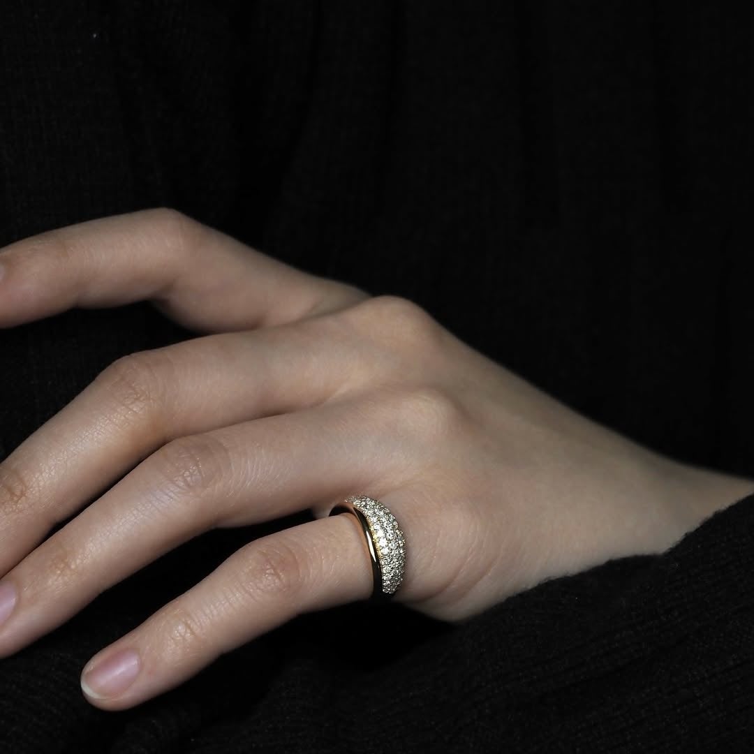 細やかなダイヤモンドをすき間なく敷き詰めた、贅沢な輝きのピンキーリング。イエロー・ホワイト・ピンクの3色のゴールドからお選びいただけます。今回は現品をご試着・ご購入いただけるまたとないチャンスとなっております。
