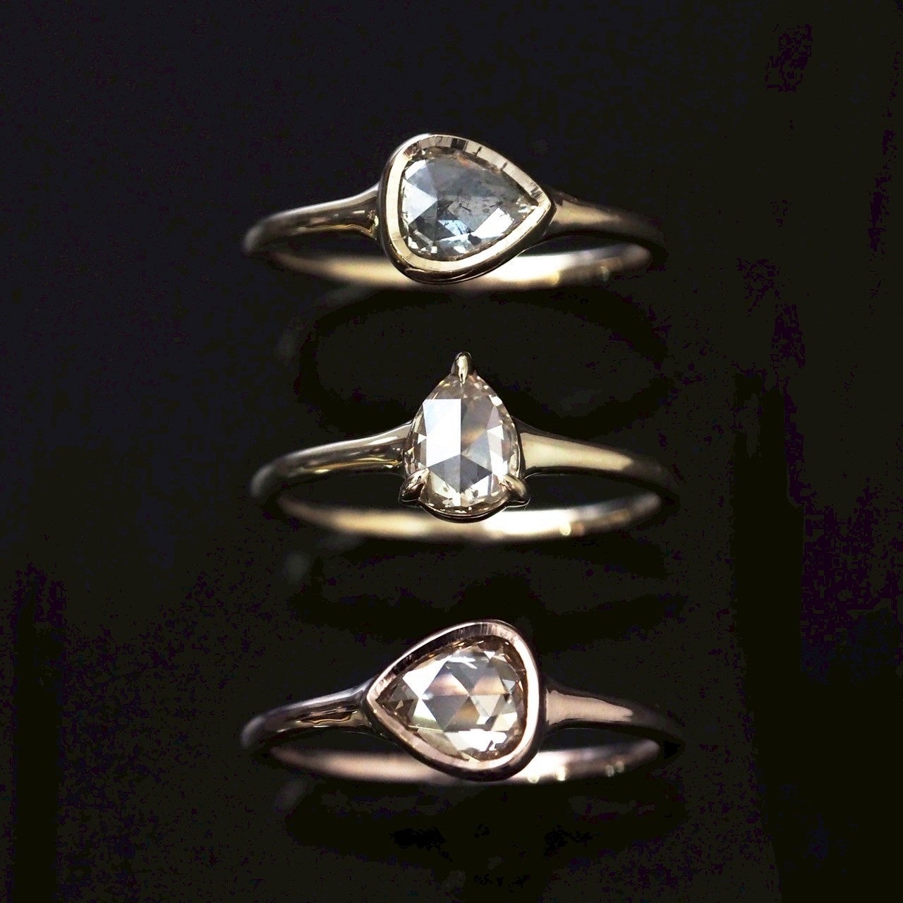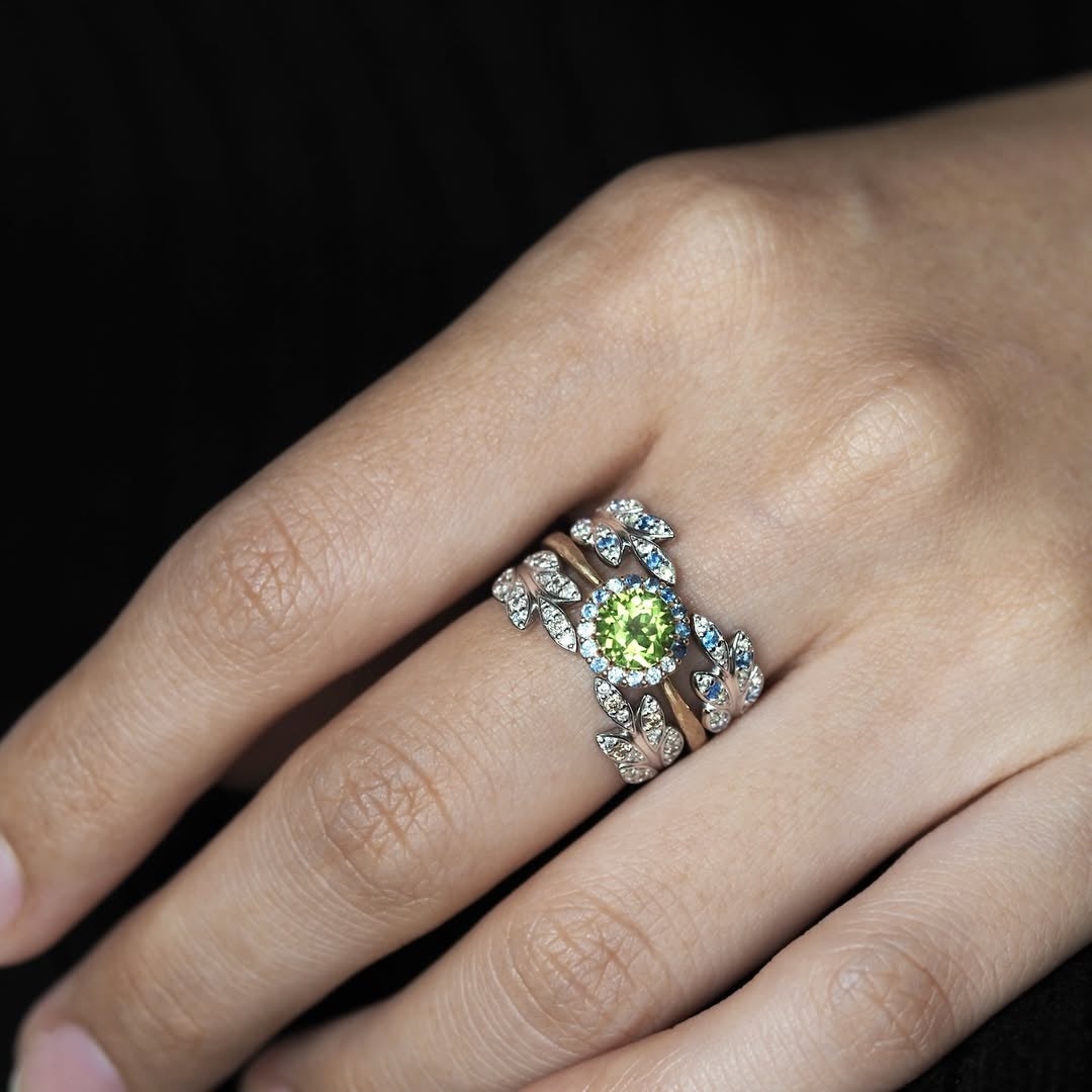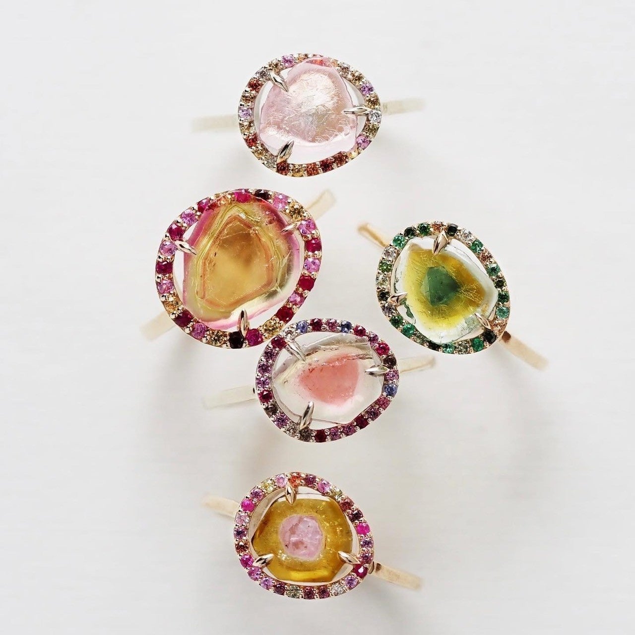 お仕立てに用いるのは、整えすぎず、削りすぎないラフカットの天然石。ありのままの輪郭を残した“地球のかけら”を、繊細な3本爪でそっと留め、周囲にはメレストーンが静かに添えられます。石と取り巻きのあいだに生まれるわずかな“隙間”が、風が通り抜けるような軽やかさと、余韻をジュエリーにもたらしてくれます。