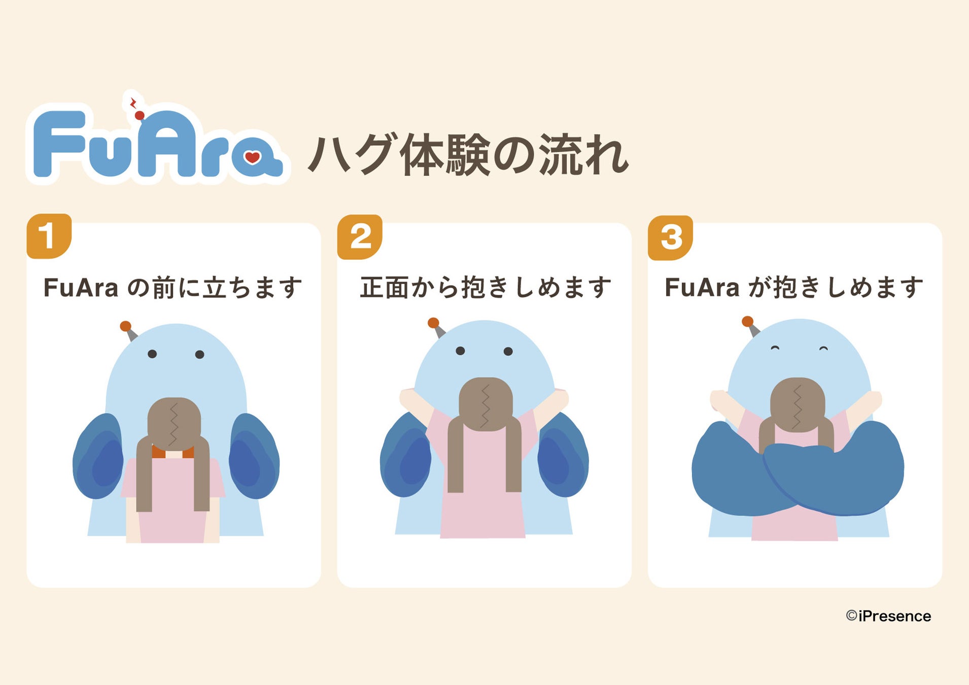 来場者がFuAraに近づくと、FuAraがあなたを優しくハグします。ハグをするとFuAraの鼓動を感じながら離れた場所から送られる、心のこもった温もりを体感できます。