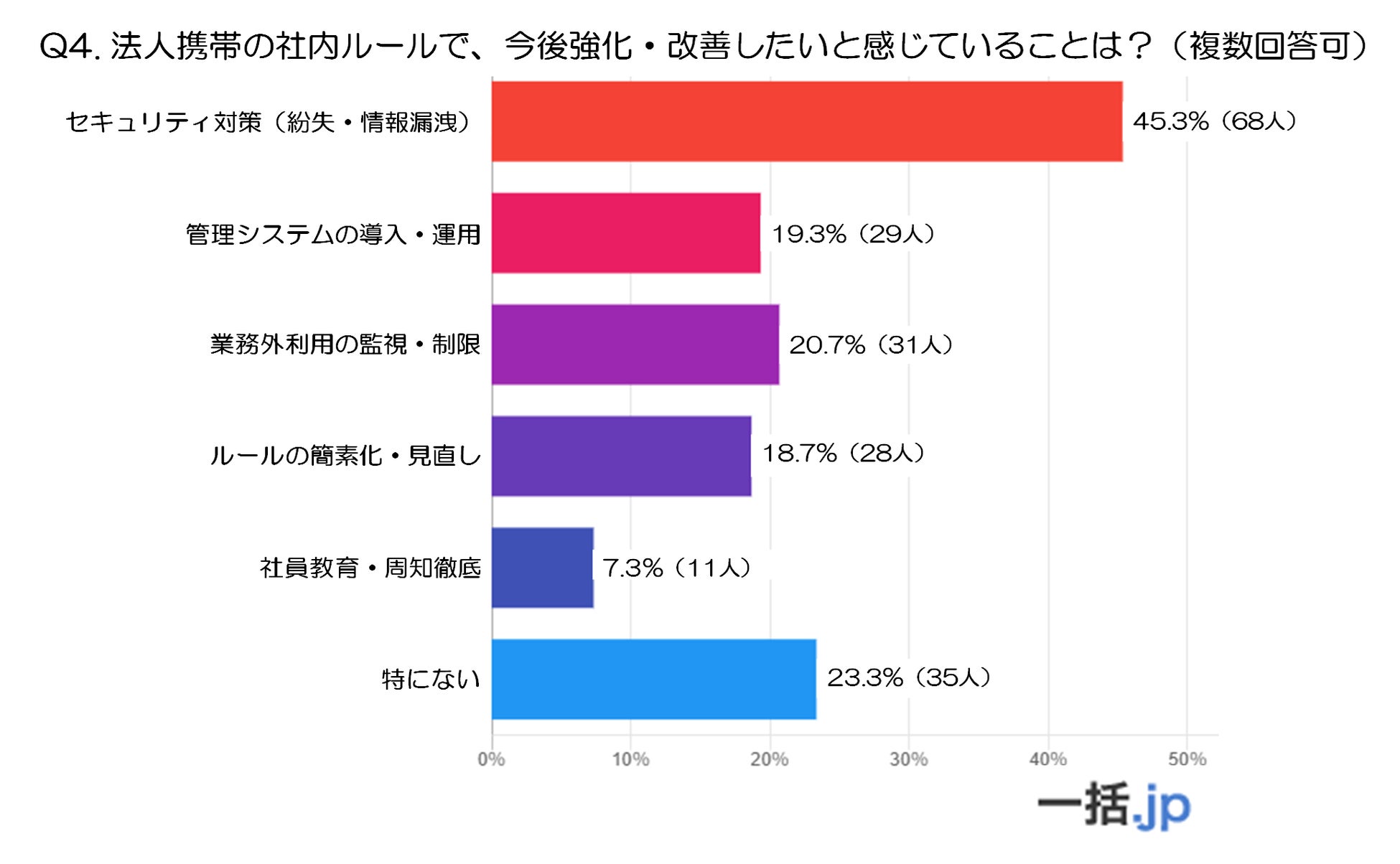 最も多かった回答は「セキュリティ対策(紛失・情報漏洩)」で、全体の45.3%(68人)が今後の強化ポイントとして挙げています。法人携帯の運用において、万が一の紛失や情報漏洩リスクを防ぐための体制づくりが、引き続き最重要課題となっていることがうかがえます。