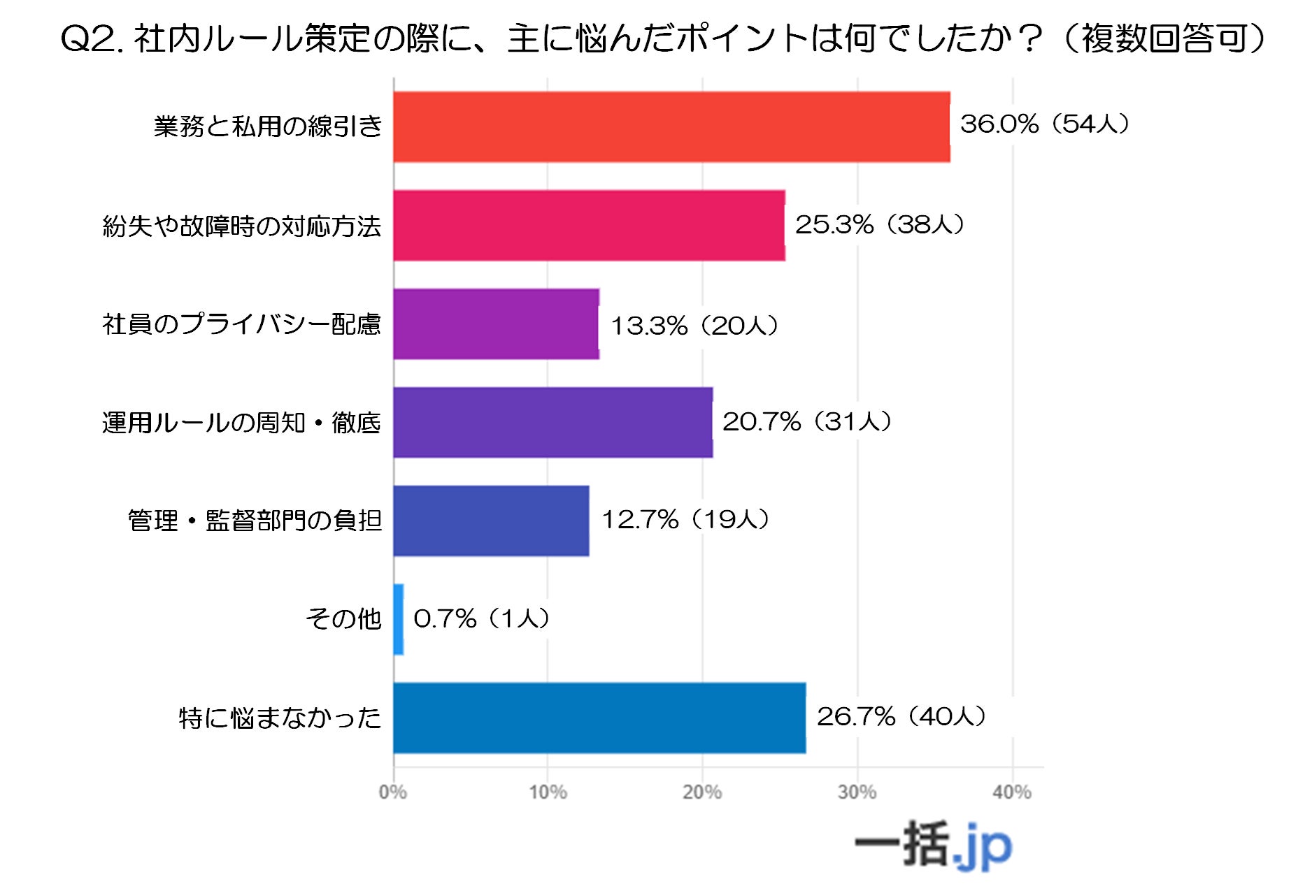また、「紛失や故障時の対応方法」を悩みとして挙げた企業も25.3%(38人)にのぼります。紛失や故障といった緊急時に迅速かつ適切に対応できるルールを明文化する重要性を多くの企業が認識しているようです。
