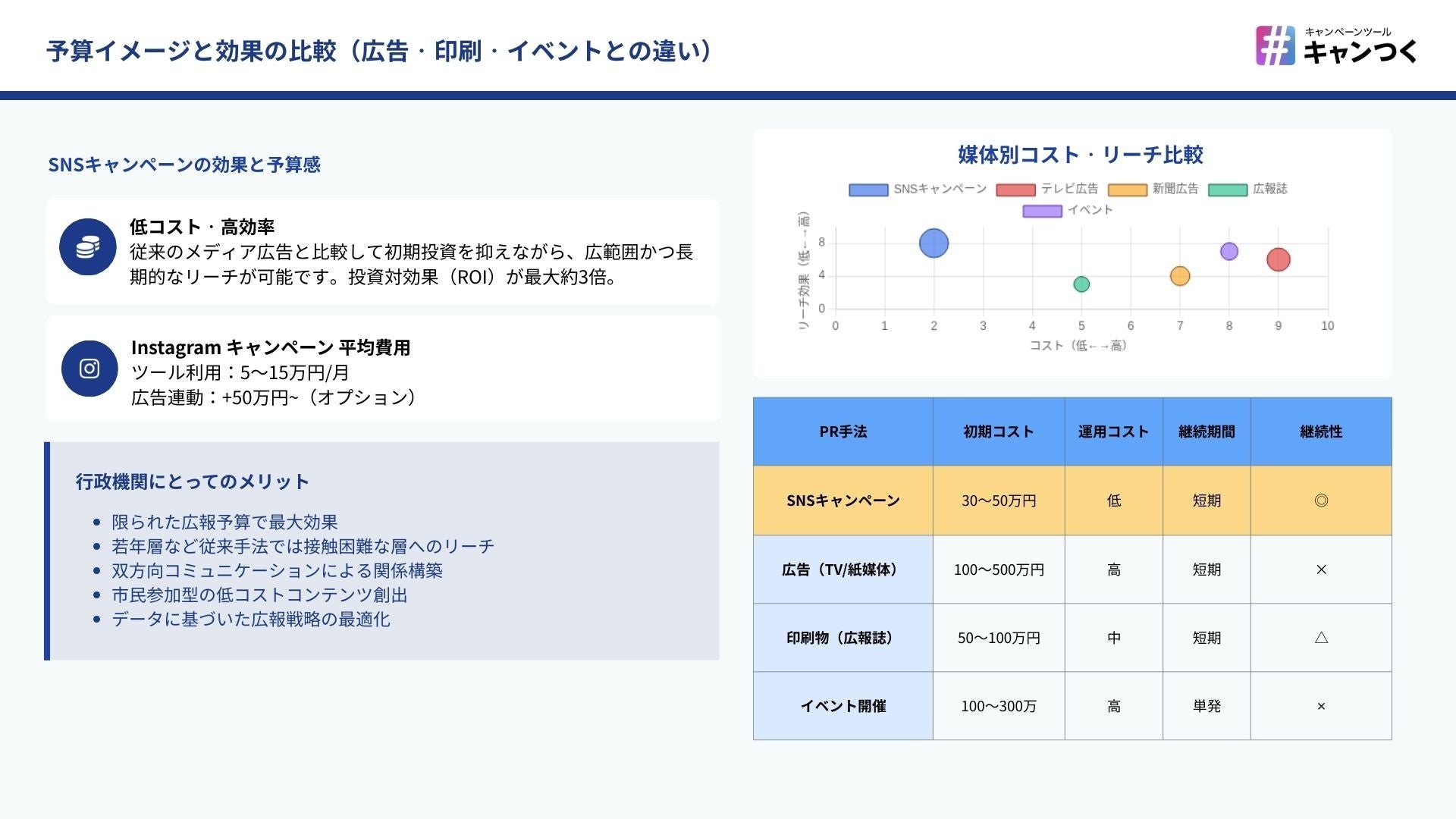 行政機関がInstagramを活用するメリット、市民参加型キャンペーンの具体的手法、自治体成功事例、広告・印刷物との費用対効果比較、ISMS認証をはじめとする行政案件で求められるセキュリティ体制まで、プロポーザル提案に必要な情報を体系的にまとめています。