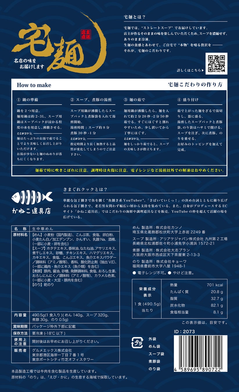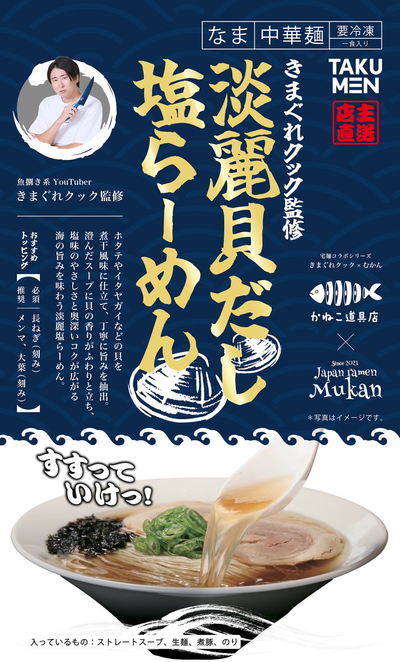 国内最大級のラーメン専門通販サイト「宅麺.com」を運営するグルメエックス株式会社(本社:東京都港区、代表取締役社長:冨澤 文秀)は、人気YouTuber「きまぐれクック」と、宅麺でも高い人気を誇るラーメン店「むかん」とのコラボによるオリジナルラーメンを販売します。本商品は、「さばいていくっ!」のフレーズで知られ、チャンネル登録者数1,400万人を超えるトップYouTuber「きまぐれクック」と、宅麺でも多くのファンに支持されている日本一食べるのが困難とも言われる「むかん」が、本企画のためだけに共同開発した特別な一杯です。貝の旨みを最大限に引き出した、ここでしか味わえない渾身のラーメンに仕上がりました。2025年7月8日(火)午後6時から「宅麺.com」にて販売をスタートし、小売店での販売も順次予定しています。詳細は公式ホームページにて随時お知らせします。