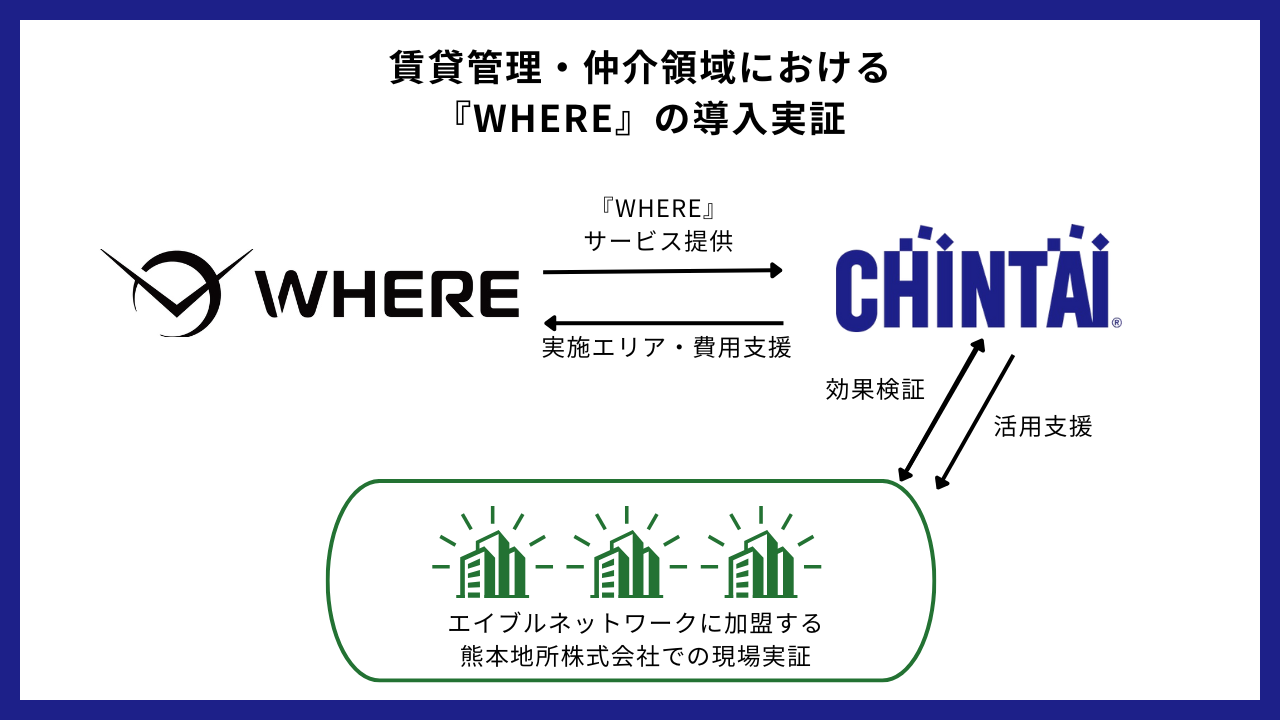お部屋探しのリーディングカンパニー株式会社CHINTAI(本社:東京都港区、代表取締役社長 奥田倫也、以下 CHINTAI)は、JAXA発のスタートアップ企業である株式会社WHERE(本社:東京都文京区、代表取締役 阿久津岳生、以下 WHERE)と提携し、熊本エリアにおいて不動産事業者向けに賃貸管理業務のDX推進を目的としたPoC(概念実証)を開始します。