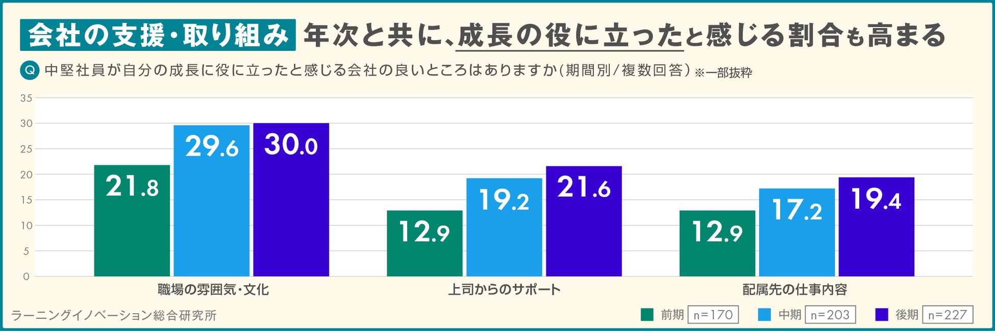 ミドルキャリア前期では「表彰制度」、中期・後期では「職場の雰囲気・文化」「上司からのサポート」「仕事内容」が成長の役に立ったと感じる結果に