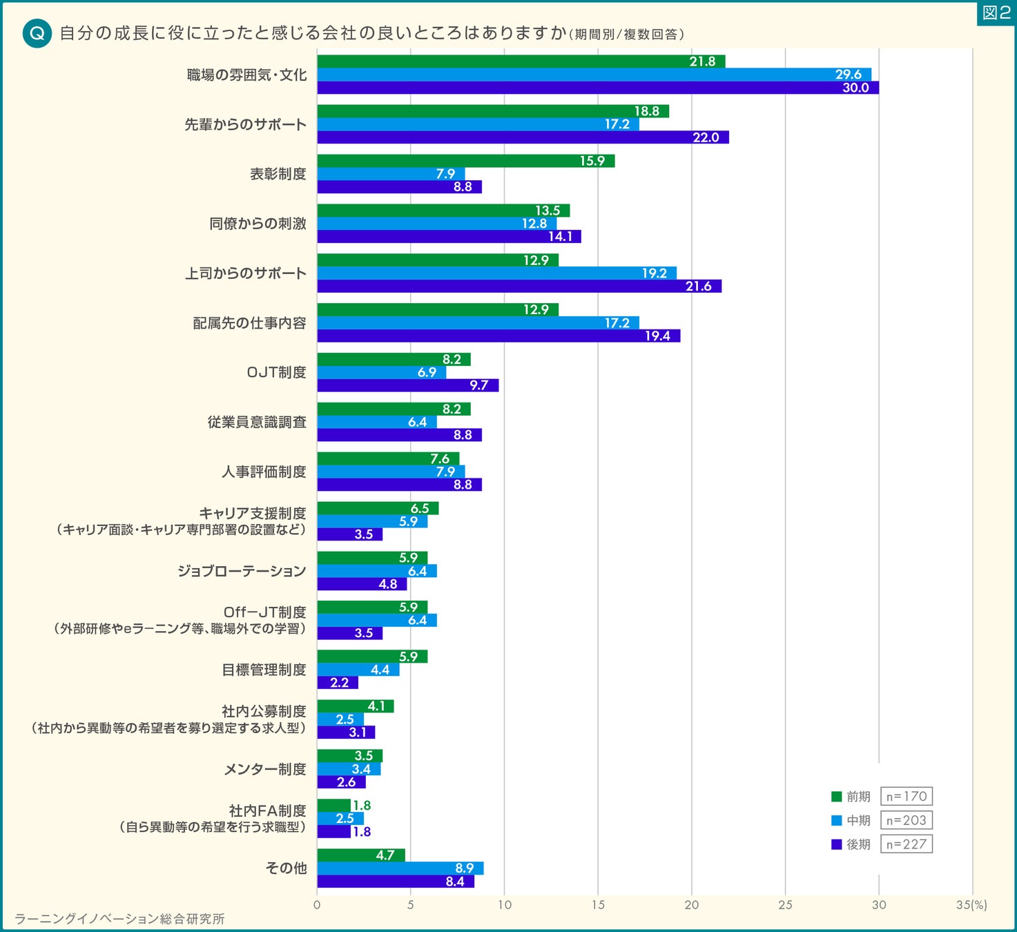 2.ミドルキャリア前期では「表彰制度」、中期・後期では「職場の雰囲気・文化」「上司からのサポート」「仕事内容」が成長の役に立ったと感じる結果に