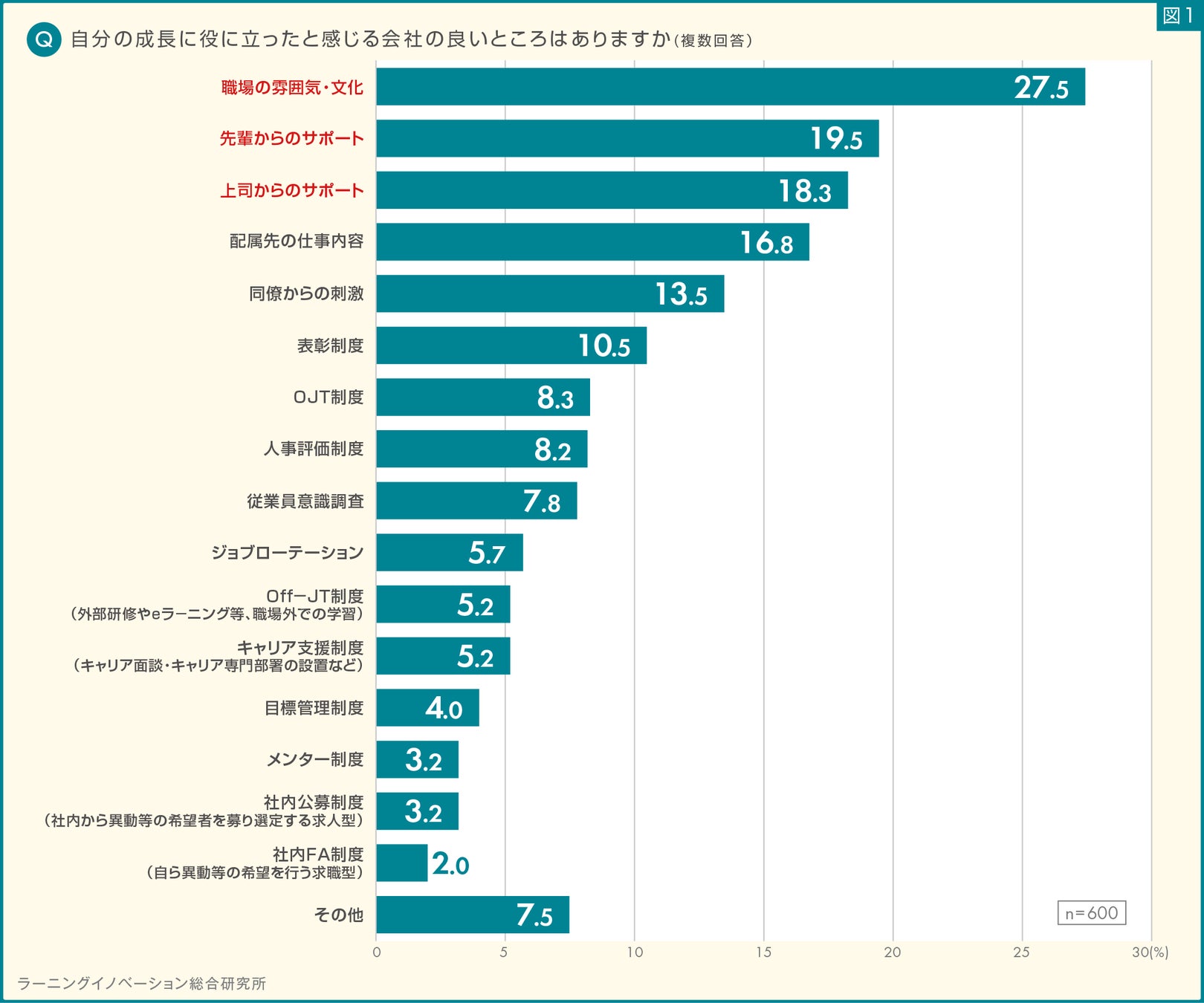 結果、「職場の雰囲気・文化」が27.5%と最も高い割合となりました。次に、「先輩からのサポート」が19.5%、「上司からのサポート」が18.3%と続きました。一方、社内FA制度、社内公募制度、メンター制度、目標管理制度など、制度面の項目は低い結果となりました。(図1)