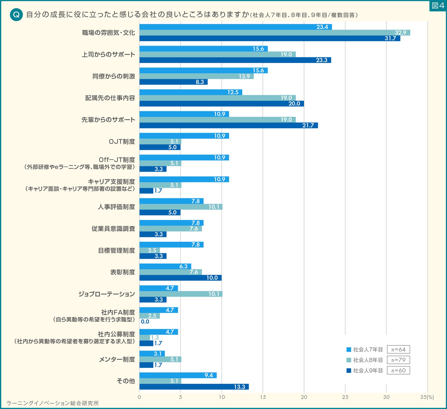 一方、「同僚からの刺激」は、社会人7年目の15.6%から減少傾向にあることもわかりました。(図4)