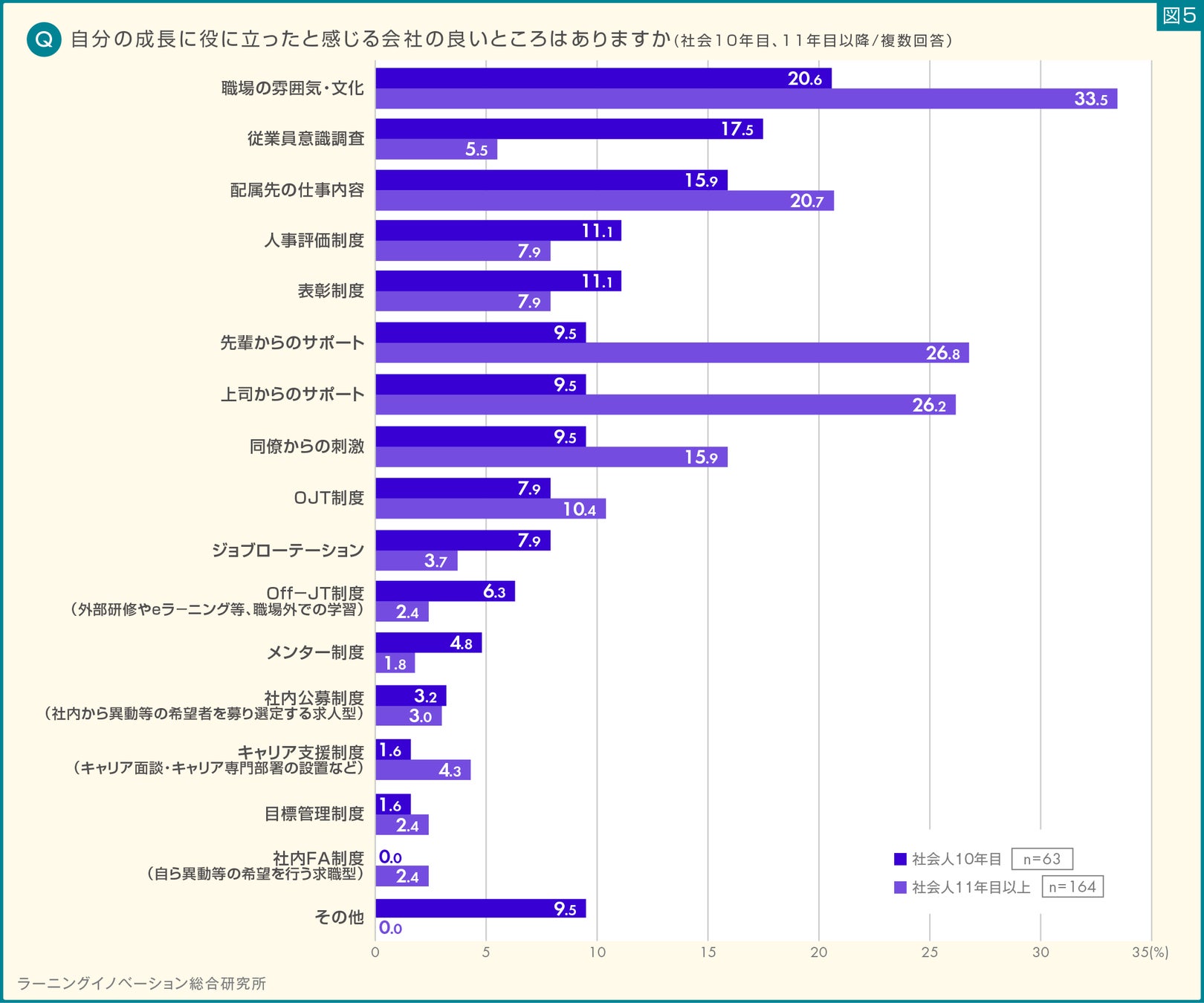 社会人11年目以降では「職場の雰囲気・文化」が33.5%と最大の割合となり、この割合は全年次の中で最も高い割合になりました。次に、「先輩からのサポート(26.8%)」「上司からのサポート(26.2%)」と続き、この割合も全年次の中で最大の割合となりました。「同僚からの刺激」では、社会人9年目までは減少傾向にあったものの、社会人10年目以降はまた増加傾向にあることも注目すべき点と言えるでしょう。(図5)