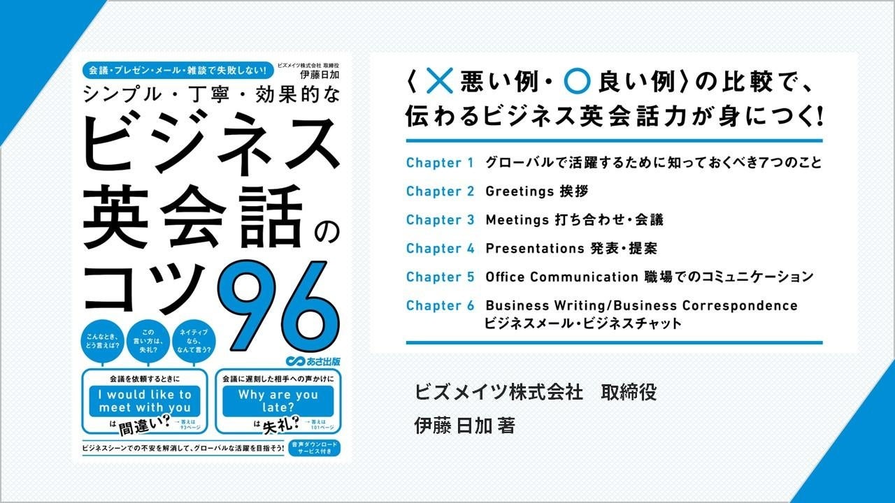 ビジネス特化型オンライン英会話事業「Bizmates」(https://www.bizmates.jp/)(以下「Bizmates」と言う。)を展開するビズメイツ株式会社(本社:東京都千代田区、代表取締役社長:鈴木 伸明 、以下「当社」と言う。)は、このたび当社の取締役であり、数多くのビジネスパーソンへの英会話指導を行ってきた伊藤 日加の著書『会議・プレゼン・メール・雑談で失敗しない!シンプル・丁寧・効果的なビジネス英会話のコツ96』を、2024年8月5日にあさ出版より発売いたしました。