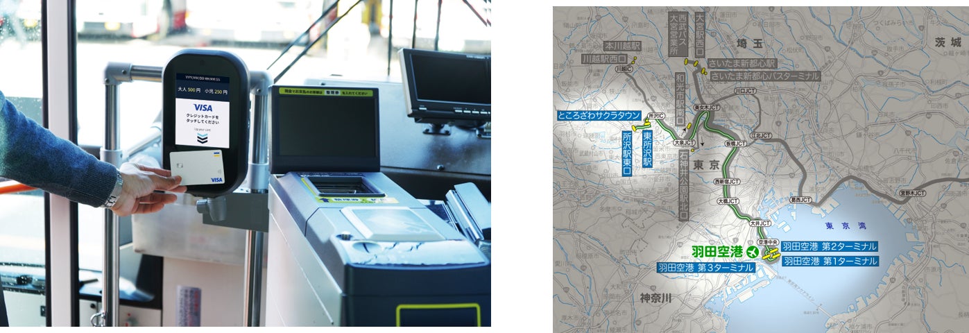 画像左:Visaのタッチ決済と「LV-700」イメージ 画像右:対象路線図