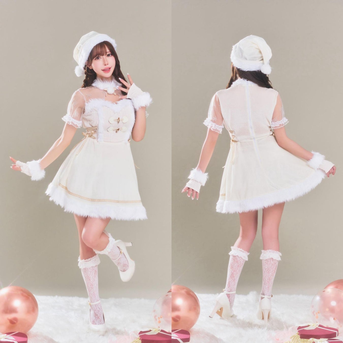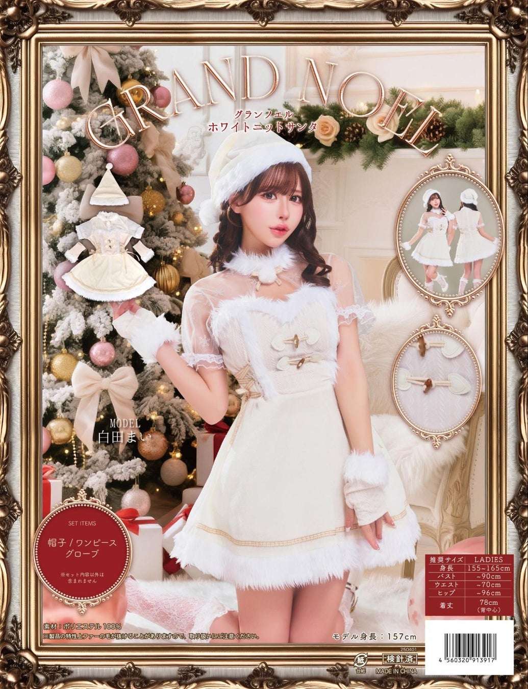 立体感のあるケーブルニット風素材を使用した、清楚で可愛らしいホワイトサンタ。スカート部分には雪の結晶柄のシースルー生地を採用し、軽やかさと華やかさをプラスしました。
