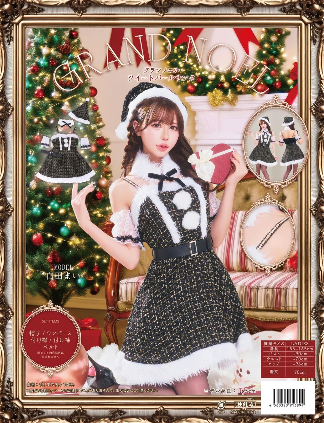 上品なブラックツイードを基調にした、大人っぽいシックな印象のサンタコスチューム。肩紐のパールとファーの付け襟が、ゴージャスで洗練された雰囲気を演出します。