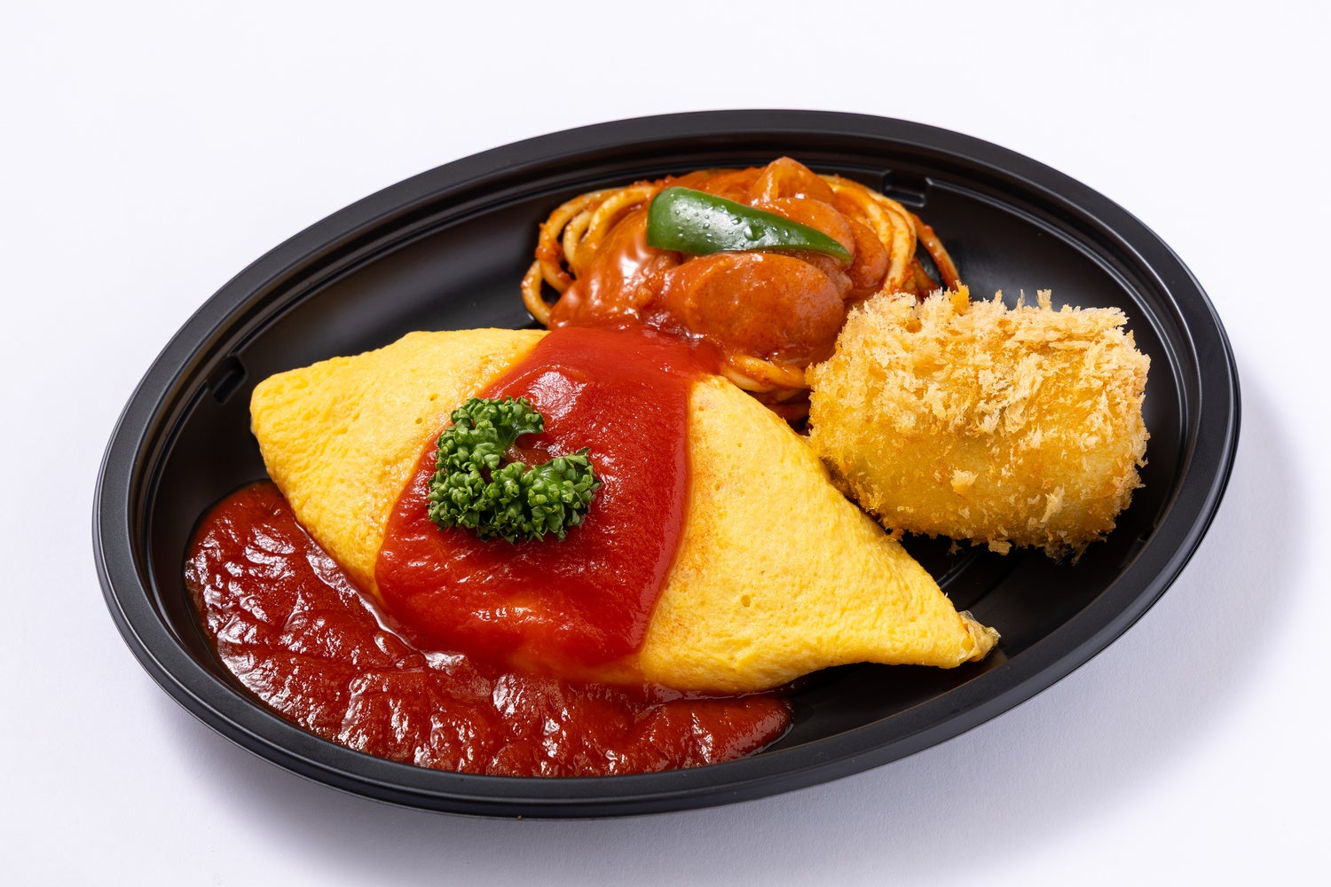 チキンのケチャップライスが入ったオムライスとオリジナルの濃厚なリッチクリームコロッケ、昔ながらのナポリタンがセットになったバランスと満足度の高いお弁当です。