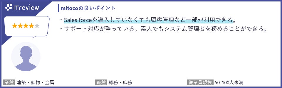 mitocoのSalesforceとの連携性を高く評価いただきました。導入していなくてもSalesforceの顧客管理などの一部の機能が利用できる点、カレンダー機能から登録する際に顧客情報を選択するだけで、顧客ごとの活動履歴を時系列に沿って蓄積できる点を評価いただいています。