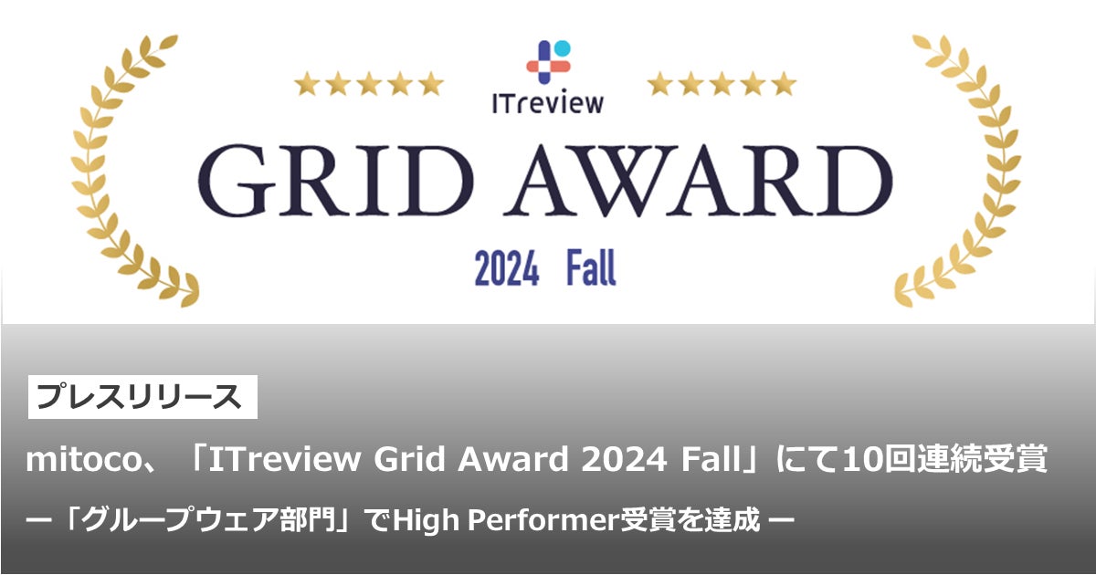 「mitoco」は、2024年10月に発表された「ITreview Grid Award 2024 Fall」の「グループウェア部門」で、顧客満足度の優れた製品に贈られる「High Performer」を10回連続で受賞しました。「High Performer」は、これから認知度が高まっていくことが予想される、いま注目の製品である称号とされています。