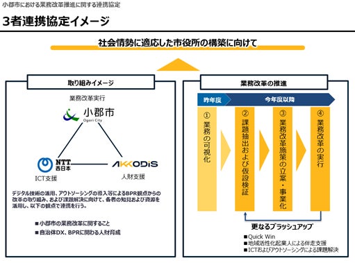 そうした背景のもと、小郡市、AKKODiSコンサルティング、NTT西日本の3者が互いに協力することで、小郡市の業務プロセス最適化に向けた取組を加速化させ、行政サービスの維持、さらには向上の実現を目指すため、連携協定を締結することになりました。