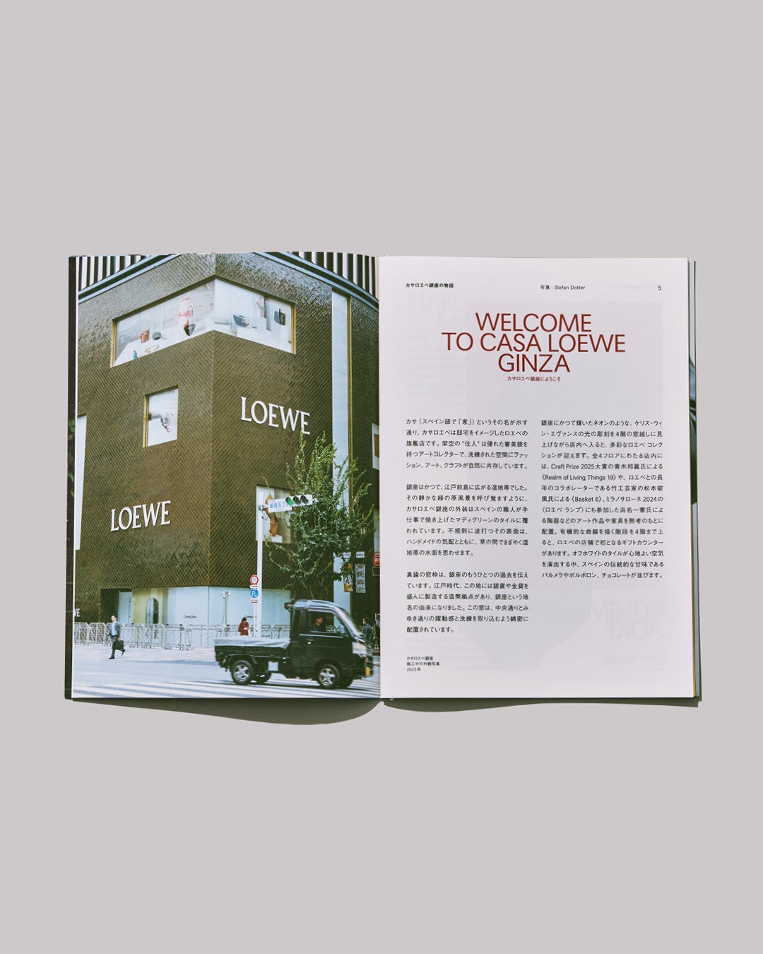 かねてより銀座は、ロエベの日本展開において重要な拠点であり、カサロエベ銀座のオープンは銀座との間に長きにわたって紡がれた関係に敬意を示しています。キャンペーン映像の公開にあわせて配布される、精彩にプリントされた銀座のシティガイドは、ロエベのエッセンスと響き合う重要な店舗や事業者を紹介しています。このガイドではカサロエベ銀座を建築的・美的観点から掘り下げているほか、キャンペーン映像についてのストーリーやキャストのインタビュー、制作の舞台裏も掲載。シティガイドは森岡書店と中村活字でも配布され、中央通りと晴海通りには1月21日(水)まで特別なフラッグを掲出します。