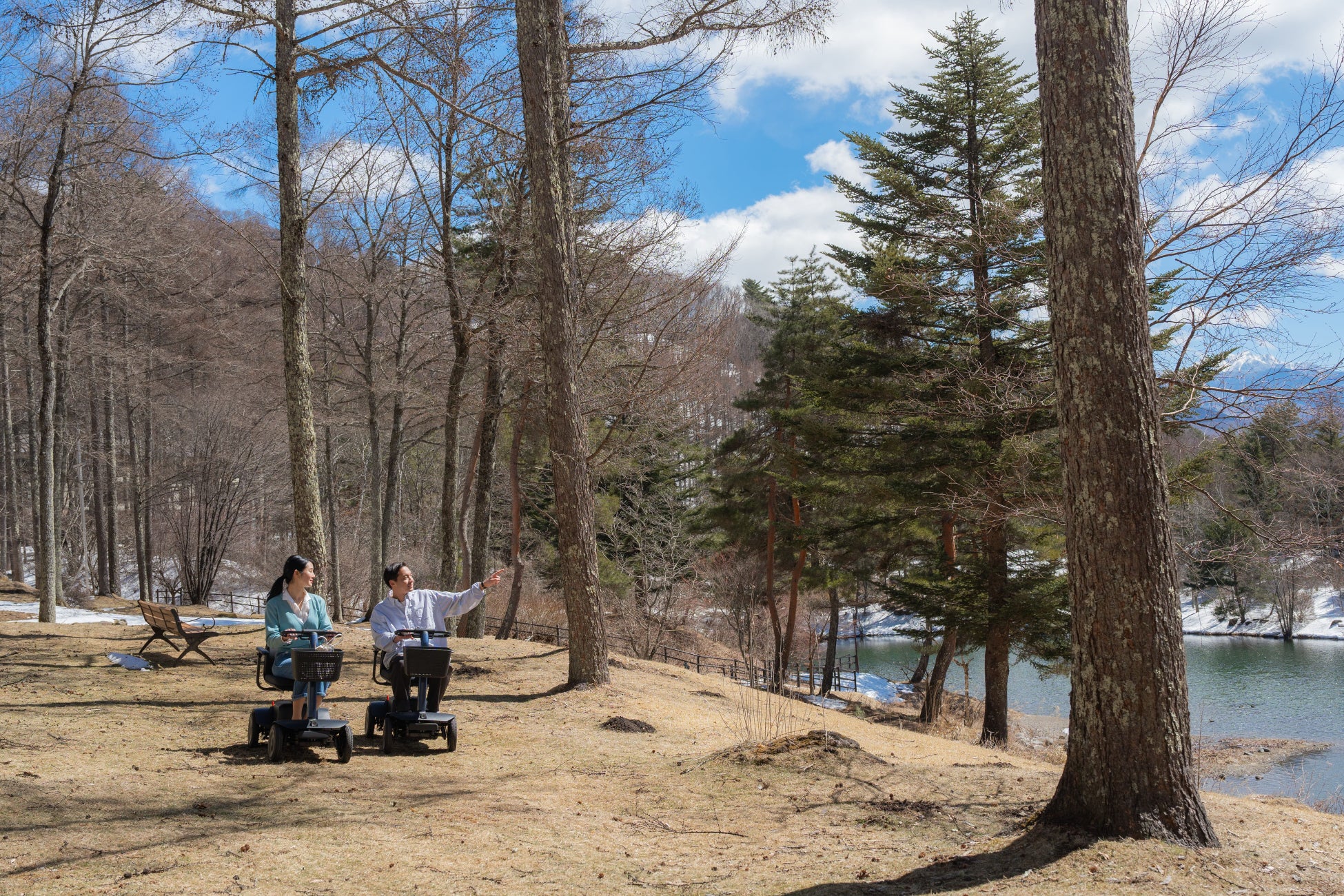 東急リゾーツ&ステイ社は、蓼科東急ホテルの周辺エリア一帯を、自然散策や森林浴を楽しめる遊歩道やホテル・コテージ、ゴルフ場やスキー場、温浴施設などを備える複合リゾート「東急リゾートタウン蓼科」として運営しています。ご家族連れなどをはじめ多くの方にご利用いただいている一方、ご高齢の方や長距離の歩行に不安がある方などにとって、体力的に十分に満喫しきれないという課題もありました。この度、シニア世代のみならず、家族3世代や若い世代にもゆっくりと自然を満喫いただくとともに、自然の魅力を発見いただける新たな散策体験を提案するべく、移動用モビリティとして歩道を走れる4輪スクータータイプの「WHILL Model S」を2台導入し、ホテル宿泊客向けに貸出を開始いたします。サイクリングやトレッキングといったアクティビティも普段から多くの方にご好評をいただいていますが、普段自転車に乗り慣れない方や、徒歩で散策したいご家族やご同行者と同じペースで周りたい方、体力や疲れが心配な方にとって気軽にご利用いただけます。
