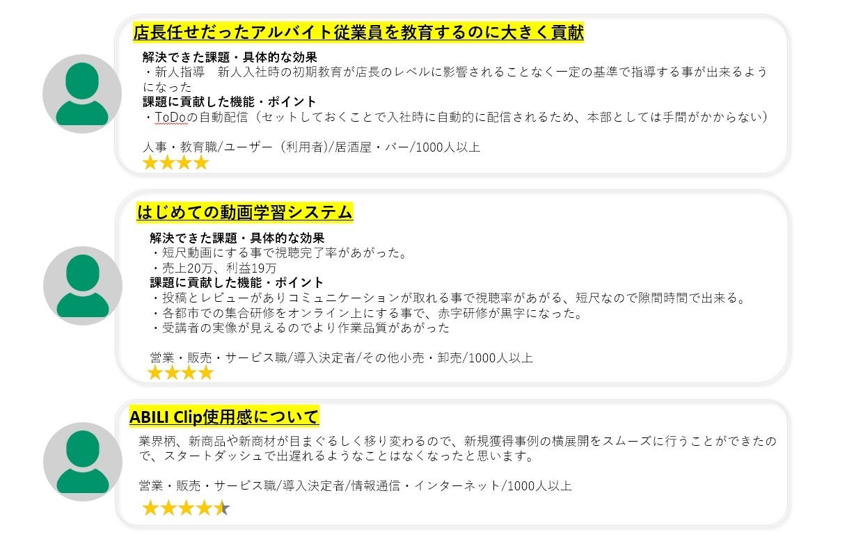 ABILI Clipは、短尺動画などのコンテンツと双方向のコミュニケーションの仕組みを活用し、「経営層」「ミドル層」「現場」全ての課題を解決する実行支援システムです。スタッフの役割・能力に応じた適切な教育や業務徹底に加え、デジタル上でのナレッジマネジメントを実現します。