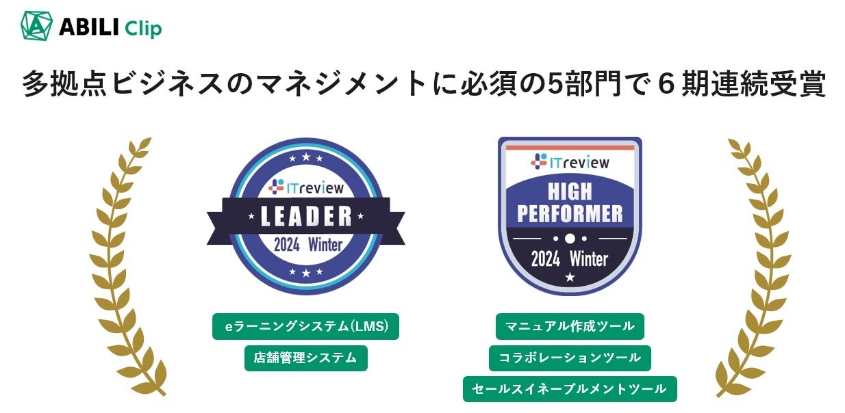 ITreview Grid Award 2024 winterにおいてABILI Clipが多拠点ビジネスのマネジメントに必須の5部門で6期連続受賞
