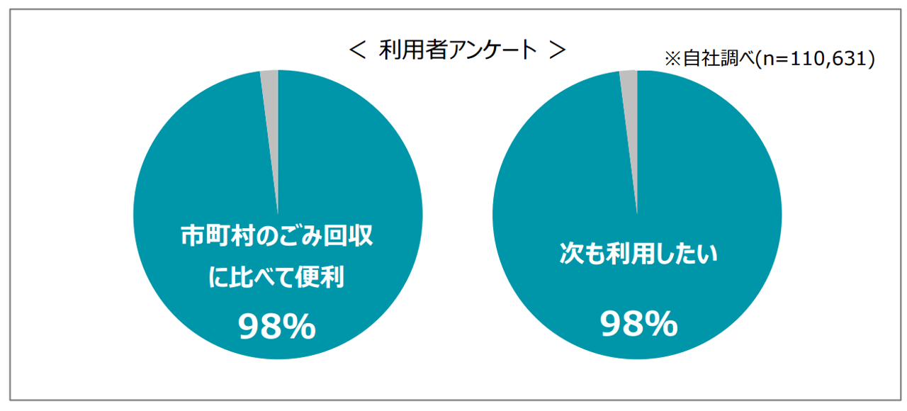 利用者アンケートでも98%の方が「市町村のごみ回収に比べて便利」、98%が「次も利用したい」と回答し、満足度の高いサービスとして評価をいただいています。