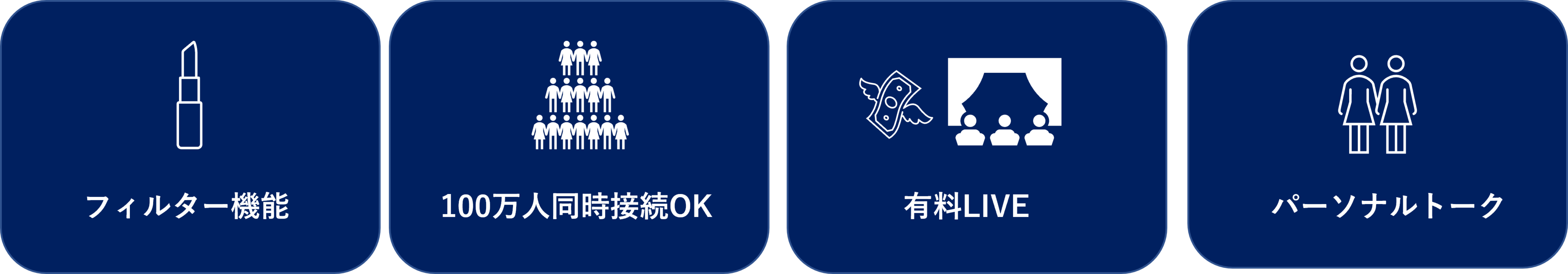 また、グランドオープンに伴い、ライブ配信における豊富な顔フィルター機能や、100万人の同時接続が可能となる環境構築を行いました。今後も各種アップデートを予定しており、これによって、利用層を増やしてまいります。