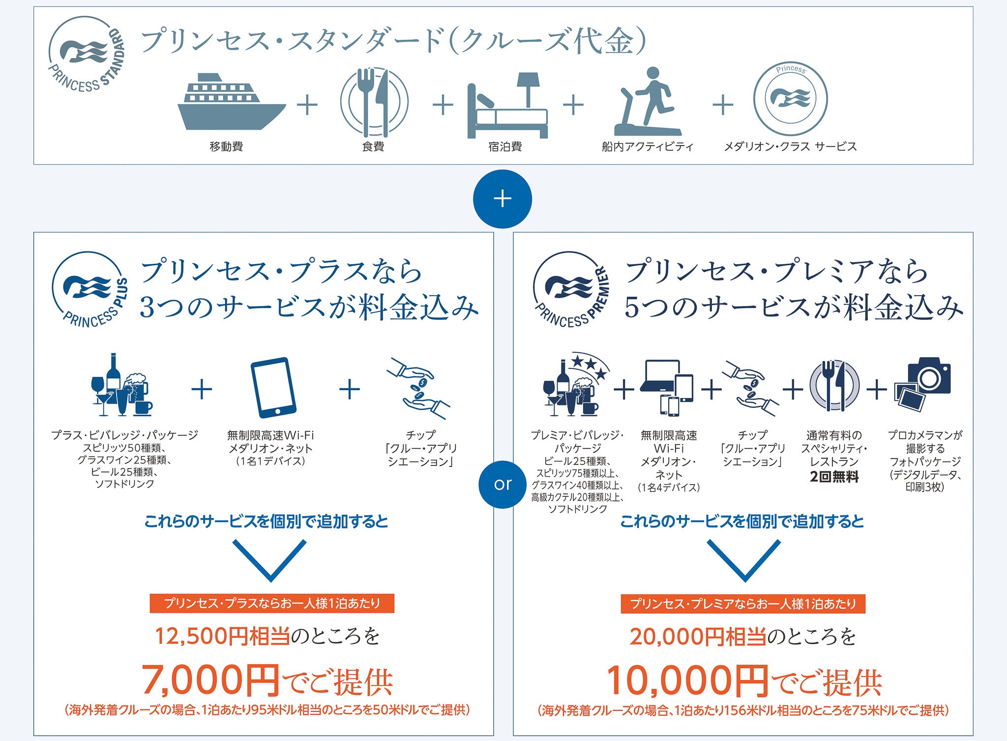- プリンセス・プラス(お一人様1泊あたり7,000円でご提供):無制限高速Wi-Fiメダリオン・ネット(1名1デバイス)、プラス・ドリンク・パッケージ<12ドル以下のアルコール(スピリッツ50種類、グラスワイン25種類、ビール25種類)、ボトルワイン25%割引、スペシャリティ・コーヒー、ミネラルウォーター、ソフトドリンク>、チップ「クルー・アプリシエーション」を含む