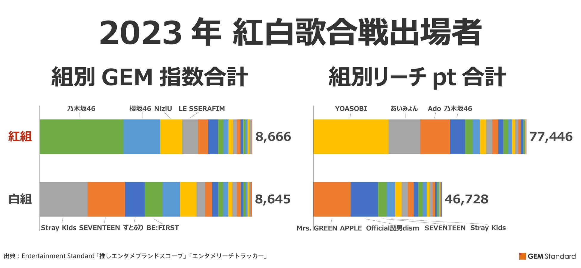紅白は歌合戦であり、最後に勝敗が付くわけですが、仮に普段からリーチしている人、推しファンの量で決まるのだとすると、どちらが勝つことになるでしょうか。推しファンが作るエンタメブランド価値を示す「GEM指数」と音楽/アーティストとしての接触量を示すリーチptの紅組・白組の合計は以下の通りです。