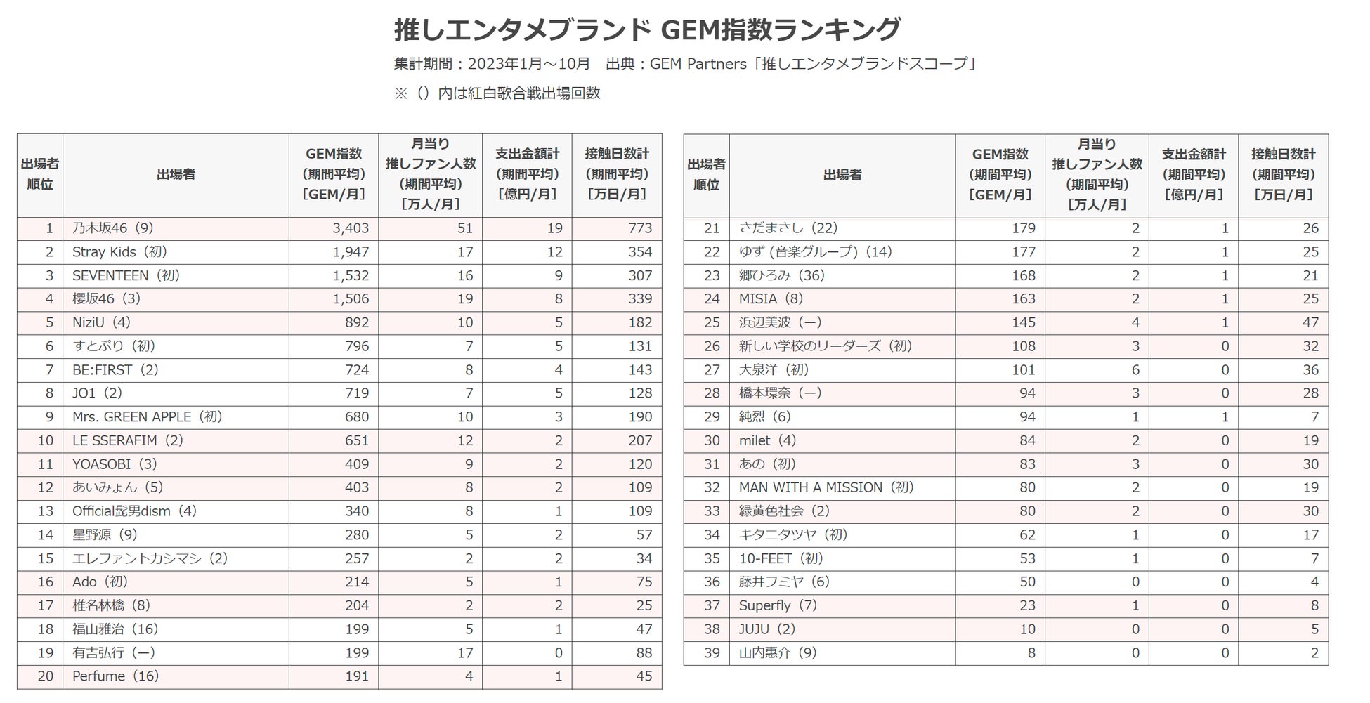 以下は、「推しエンタメブランドスコープ」の2023年1月~10月までのデータをもとに作成した、司会者を含む出場歌手の「推しファン」が作るエンタメブランド価値(GEM指数)のランキングです。