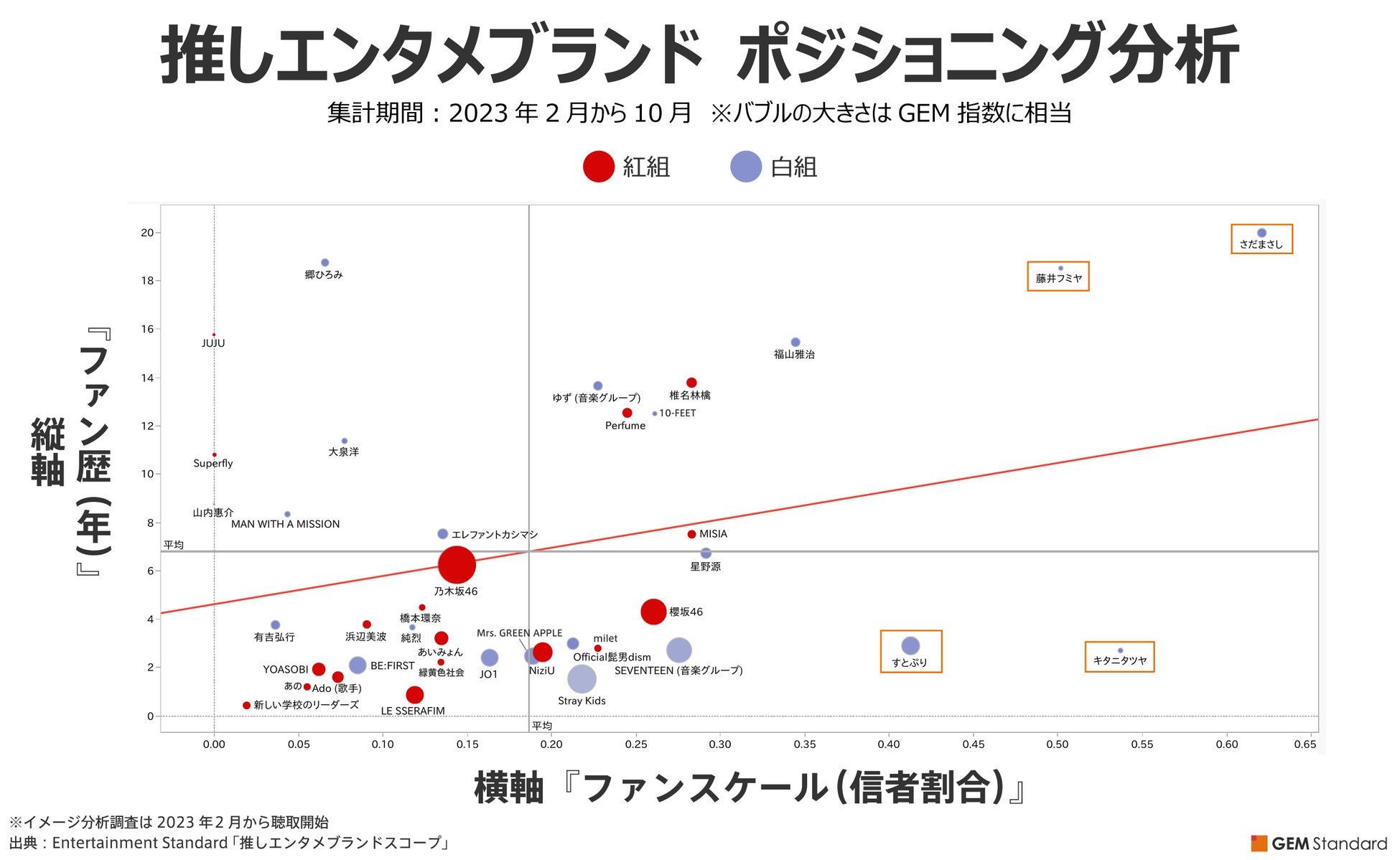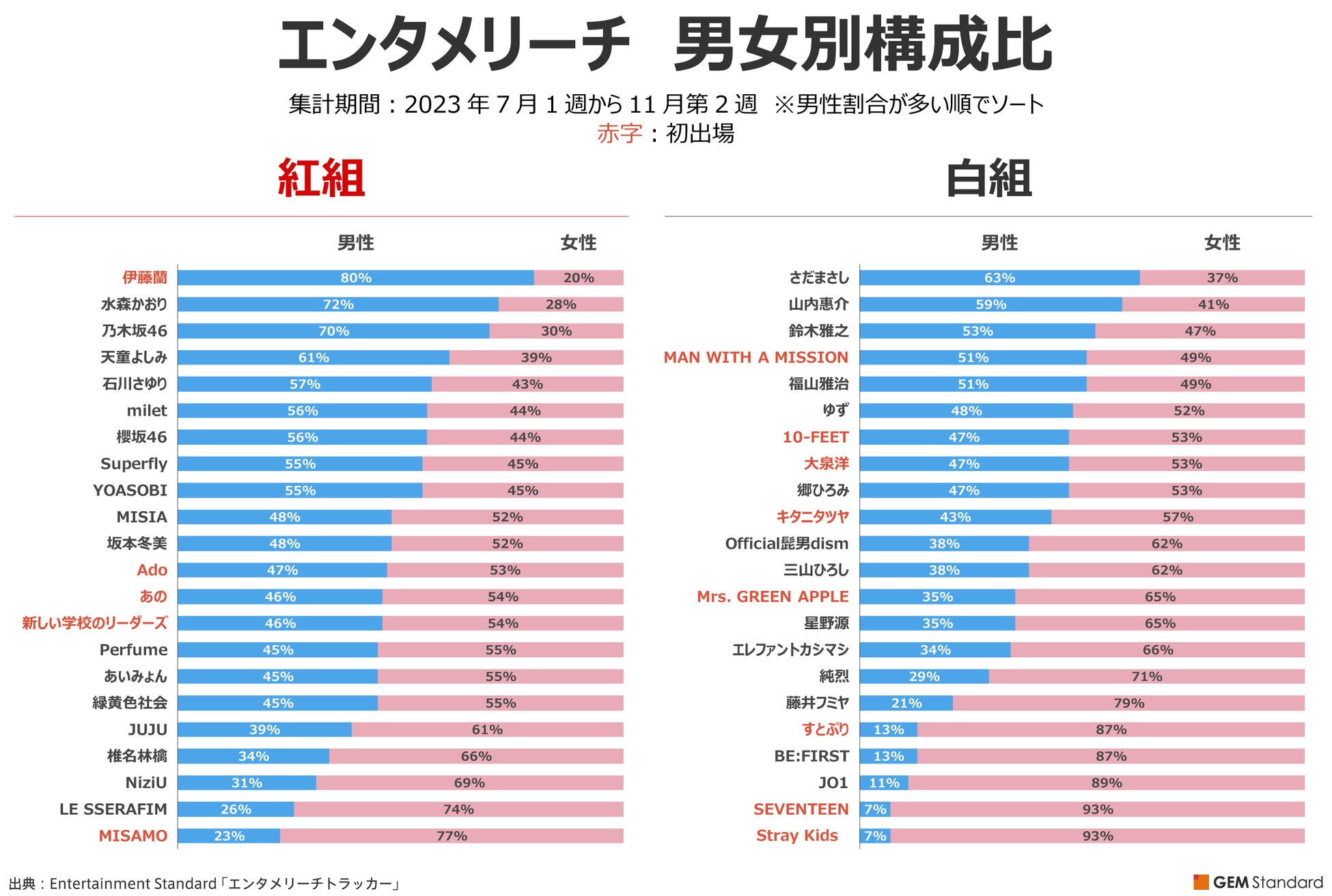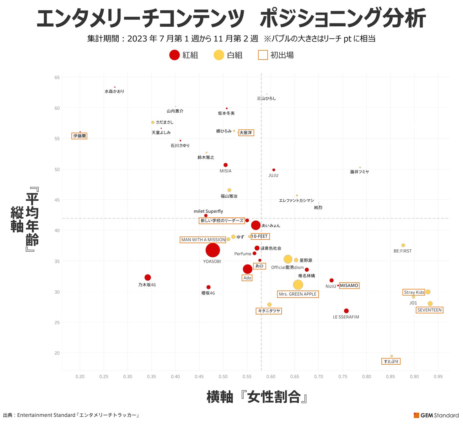 エンタテイメント業界に向けたデータ×デジタルマーケティングサービスを提供するGEM Partners株式会社(ジェムパートナーズ、所在地:東京都港区、代表取締役:梅津文)は、弊社の新商品「推しエンタメブランドスコープ」及び「エンタメリーチトラッカー」のデータをもとに、紅白の司会者、出場歌手の推しファンから作られる「エンタメブランド価値」、そして音楽アーティストとしてのリーチ力に基づき、番組全体としてどのような人たちを引き付けるのか、棚卸をしました。