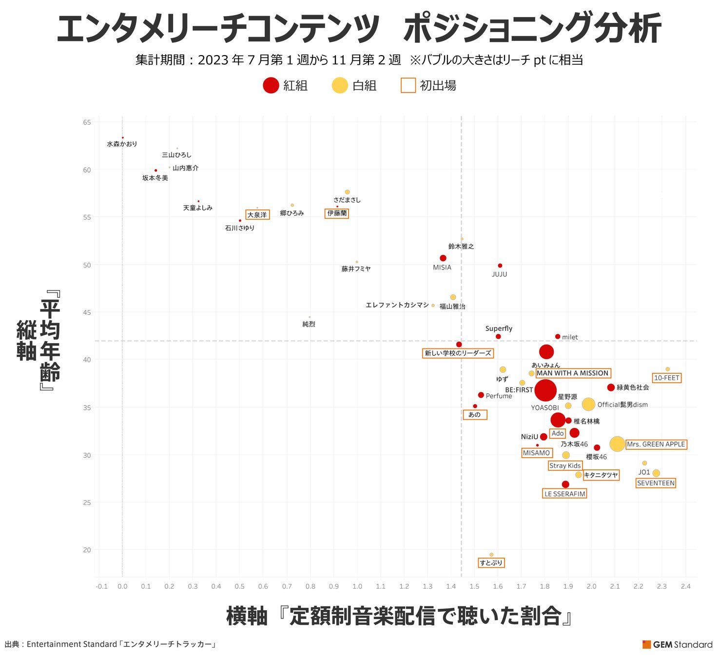このように、家族がそろうことが多い大みそかの高視聴率番組として、“推しファン”という観点でも“音楽アーティストのリーチ力”という意味でも、老若男女バランスよい出場者であり、特に初出場のアーティストによって若者層に訴求しようとしていることがうかがえます。