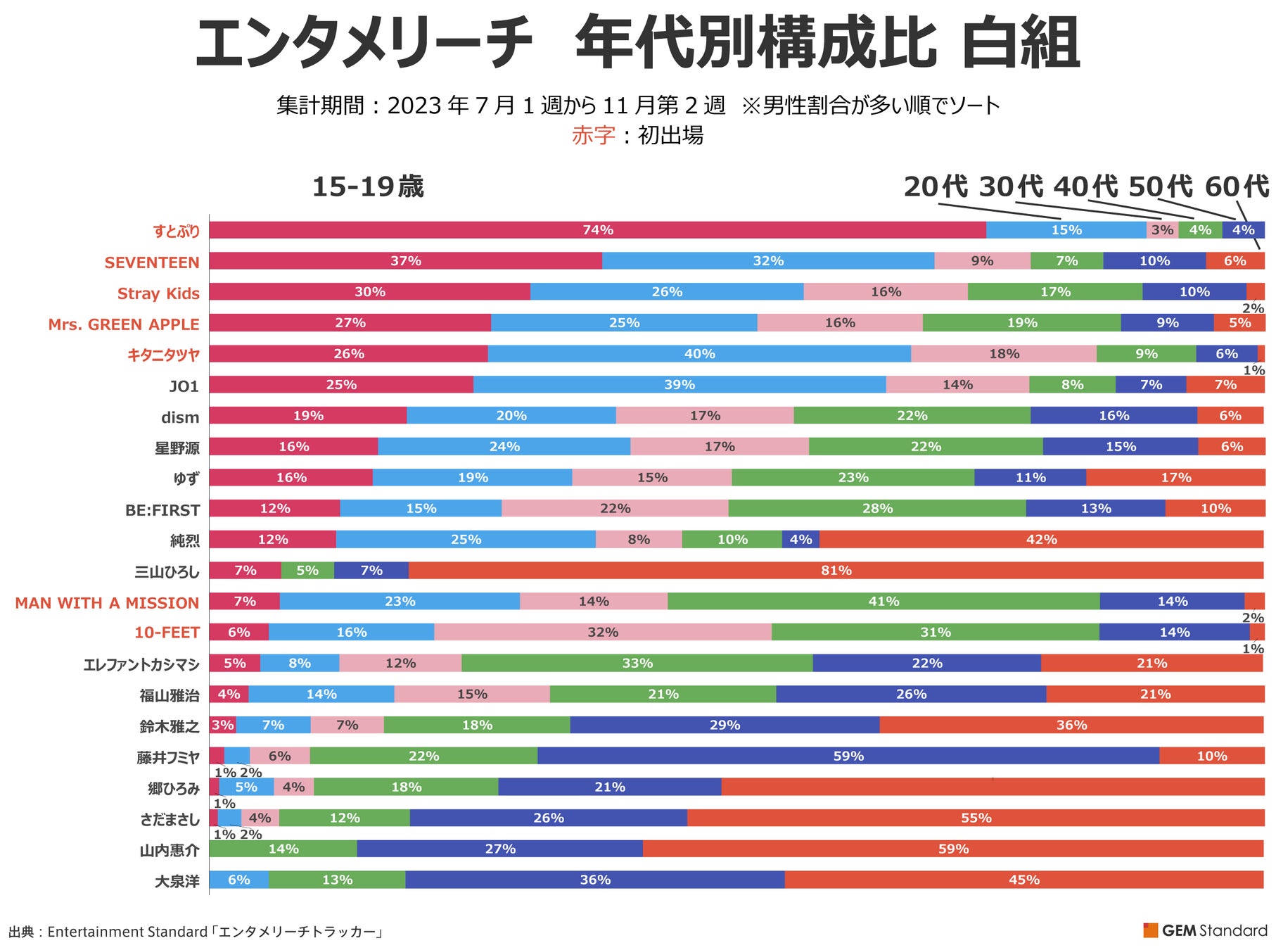 年代別構成比でも、「若者中心」「シニア中心」とばらついていますが、白組の若者層多めの『すとぷり』『SEVENTEEN』『Stray Kids』『Mrs. GREEN APPLE』『キタニタツヤ』はいずれも初出場であり、こうした新しい人気のアーティストにより若い視聴者層に訴求する意図がうかがえます。
