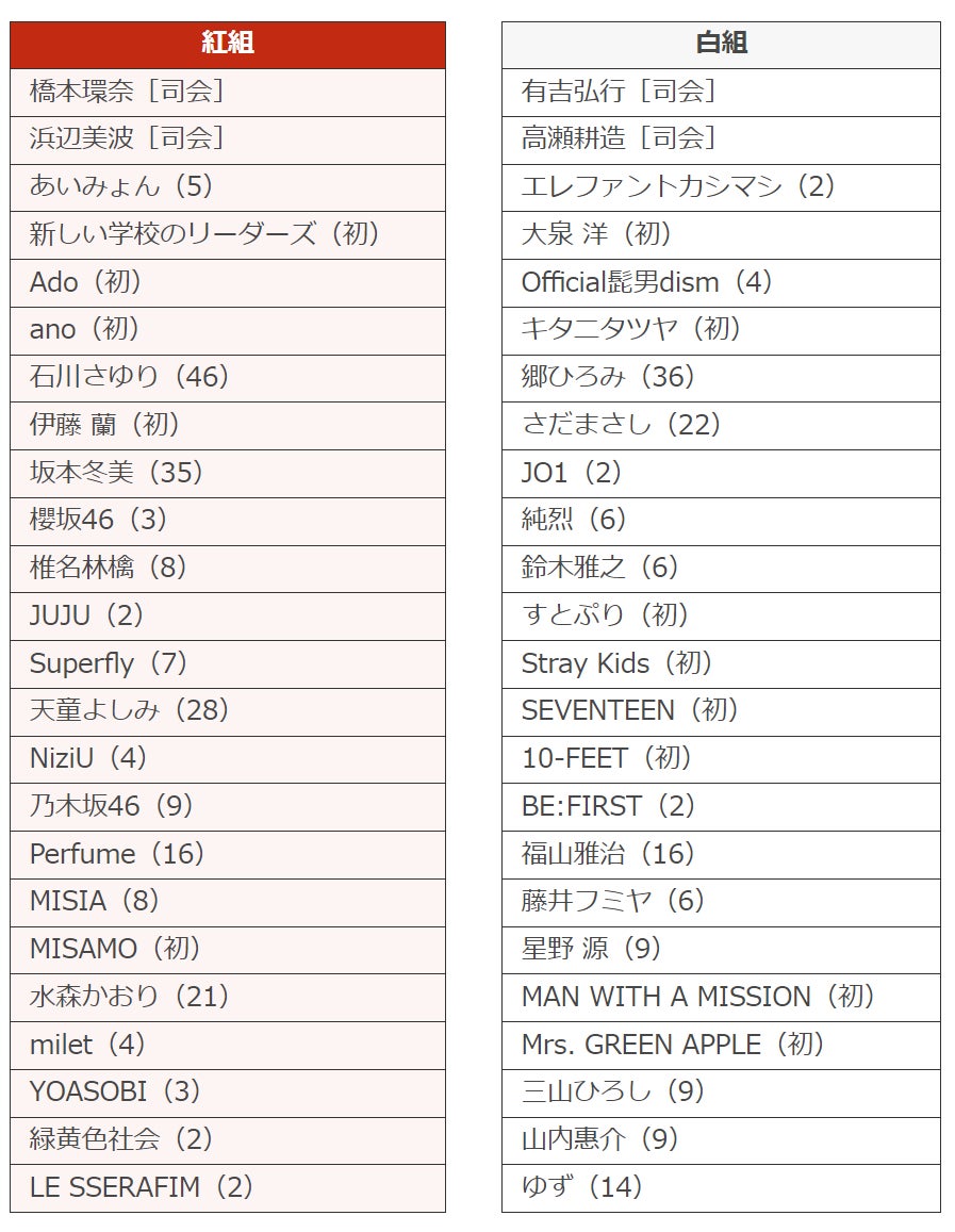 「第74回NHK紅白歌合戦」の司会者、および出場歌手は以下の通りです。