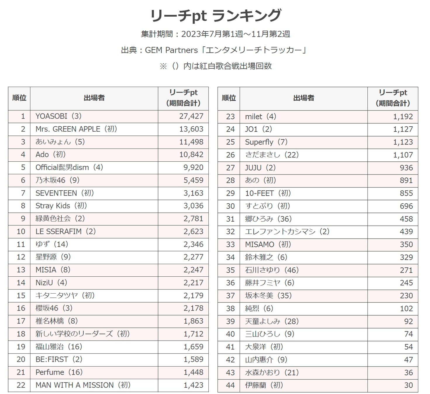 一方の音楽アーティストとしてのリーチ力の合計では、『YOASOBI』『あいみょん』『Ado』がけん引する紅組が白組を大きく引き離しました。