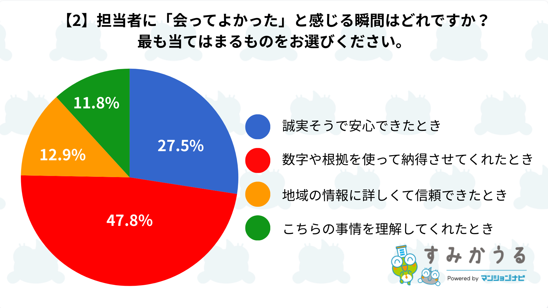 つまり不動産売却においては、誠実さと明確な根拠の両立こそが、担当者への信頼を築く鍵だと言えます。どちらか一方ではなく、この2つをバランスよく示せる担当者が、売主から最も選ばれることが、調査を通じて明確になりました。