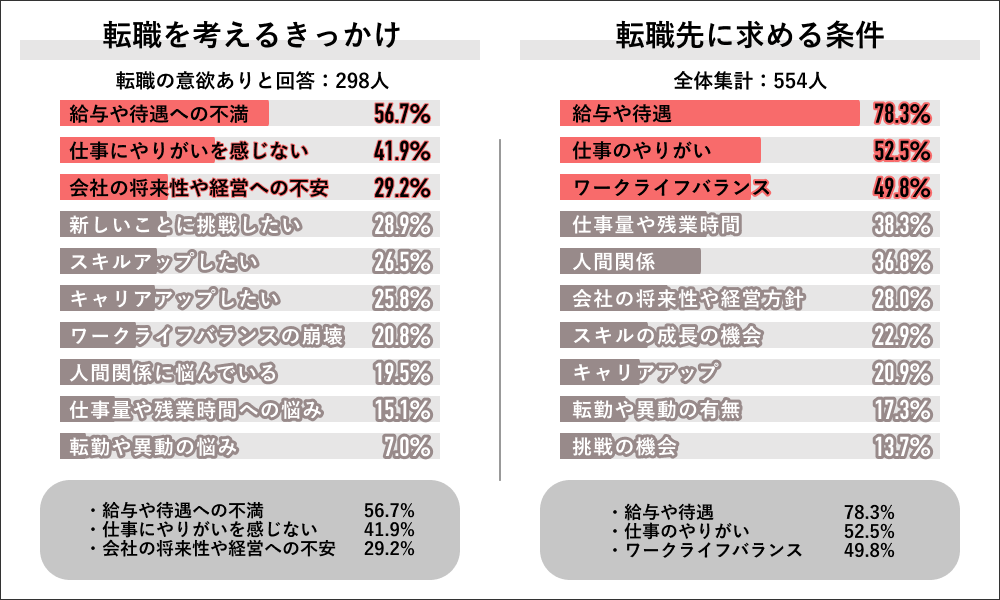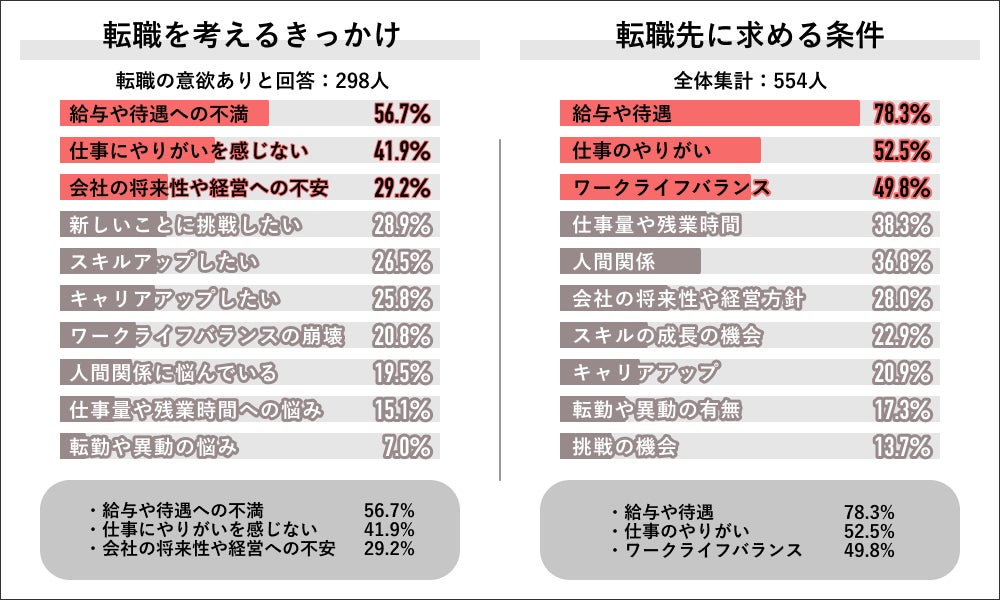 転職意欲があると回答した298人にそのキッカケを聞くと、「給与や待遇への不満」が56.7%で最多になり、次いで「仕事にやりがいを感じない」が41.9%、「会社の将来性や経営への不安」が29.2%で上位3つの回答になりました。また回答者全体の554人に転職に求める条件を聞くと、「給与や待遇」が78.3%で最多回答になり、次いで「仕事のやりがい」が52.5%、「ワークライフバランス」が49.8%で上位3つの回答でした。