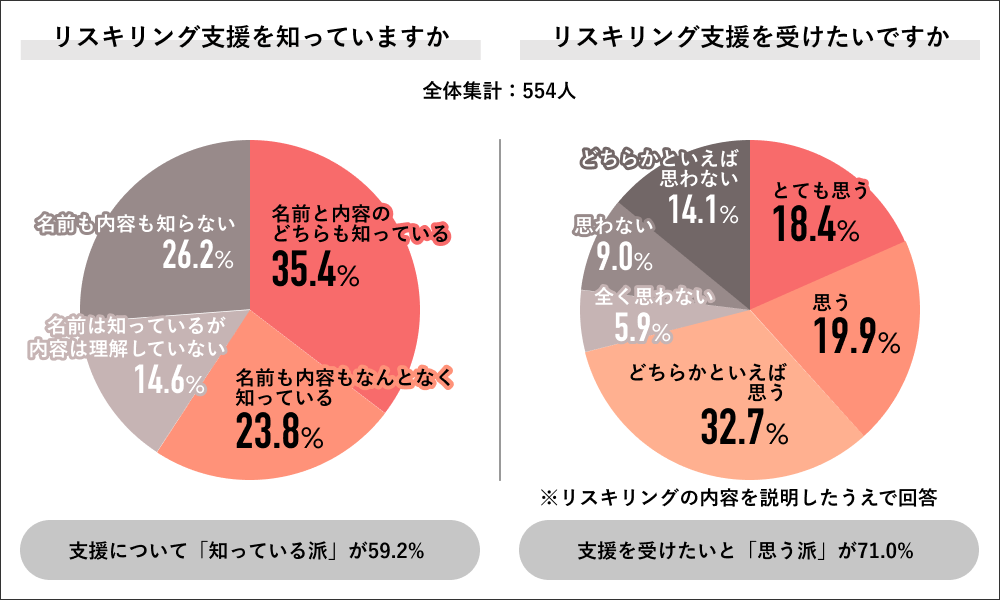 回答者全体の554人にリスキリング支援の認知を聞くと、「名前と内容どちらも知っている」が35.4%で最多回答になり、次いで「名前も内容もなんとなく知っている」が23.8%でした。これを合算した59.2%が”知っている派”の回答になり、「名前も内容も知らない」は26.2%でした。またリスキリング支援の内容を説明した上で、回答者全体の554人にリスキリング支援を受けたいかを聞くと、”受けたい派”が71.0%で過半数を占め、”受けたくない派”が29.0%でした。