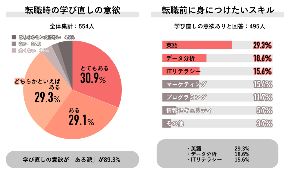 回答者全体の554人に転職時に学び直しをする意欲有無を聞くと、「とてもある」30.9%、「ある」29.1%、「どちらかといえばある」29.3%を合算した89.3%が”ある派”を回答しました。”ない派”は10.7%でした。また学び直し意欲があると回答した495人に身につけたいスキルを聞くと、「英語」が29.3%で最多回答になり、次いで「データ分析」が18.6%、「ITリテラシー」15.6%、「マーケティング」15.4%、「プログラミング」が11.7%で上位5つの回答になりました。