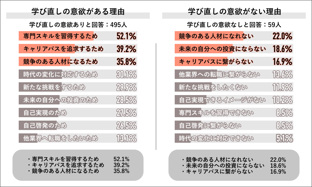 学び直し意欲があると回答した495人にその理由を聞くと、「専門スキルを習得するため」が52.1%で最多回答になり、次いで「キャリアパスを追求するため」が39.2%、「競争のある人材になるため」が35.8%で上位3つの回答結果になりました。また学び直し意欲がないと回答した59人にその理由を聞くと、「競争のある人材になれない」が22.0%で最多回答になり、次いで「未来の自分への投資にならない」が18.6%、「キャリアパスに繋がらない」が16.9%で上位3つの回答でした。
