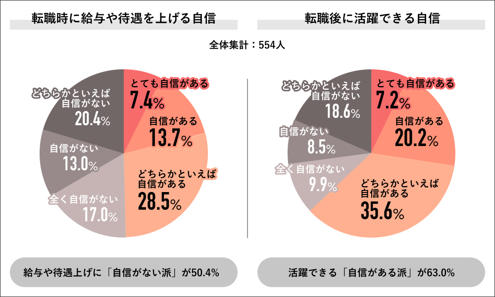 回答者全体の554人に転職による給与や待遇を上げる自信について聞くと、「全く自信がない」17.0%、「自信がない」13.0%、「どちらかといえば自信がない」20.4%を合算した50.4%が”自信なし派” で過半数を占めました。”自信がある派”は49.6%と回答しました。また、転職後に活躍できる自信を聞くと、「とても自信がある」7.2%、「自信がある」20.2%、「どちらかといえば自信がある」35.6%を合算した63.0%が”自信あり派”の回答をしました。