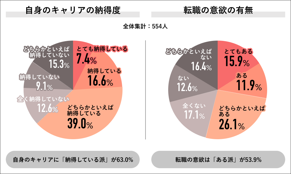 回答者全体の554人に自身のキャリアの納得度を聞くと、「とても納得している」7.4%、「納得している」16.6%、「どちらかといえば納得している」39.0%を合算した63.0%が”納得している派”を回答しました。”納得していない派”は37.0%でした。また現時点の転職意欲を聞くと「とてもある」15.9%、「ある」11.9%、「どちらかといえばある」26.1%を合算した53.9%が”ある派”を回答しました。