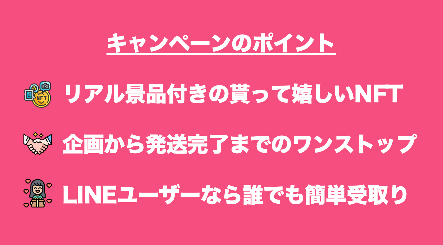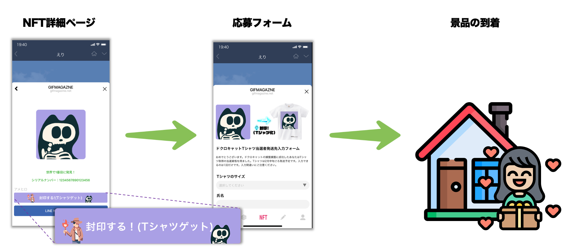 NFTギフトはLINE Blockchainを活用したNFTの配布ツールです。これまでNFTギフトでは様々なNFTの配布を行なってまいりました。今回のNFT配布はグッズ付きのNFTが抽選で当たる企画になっております。