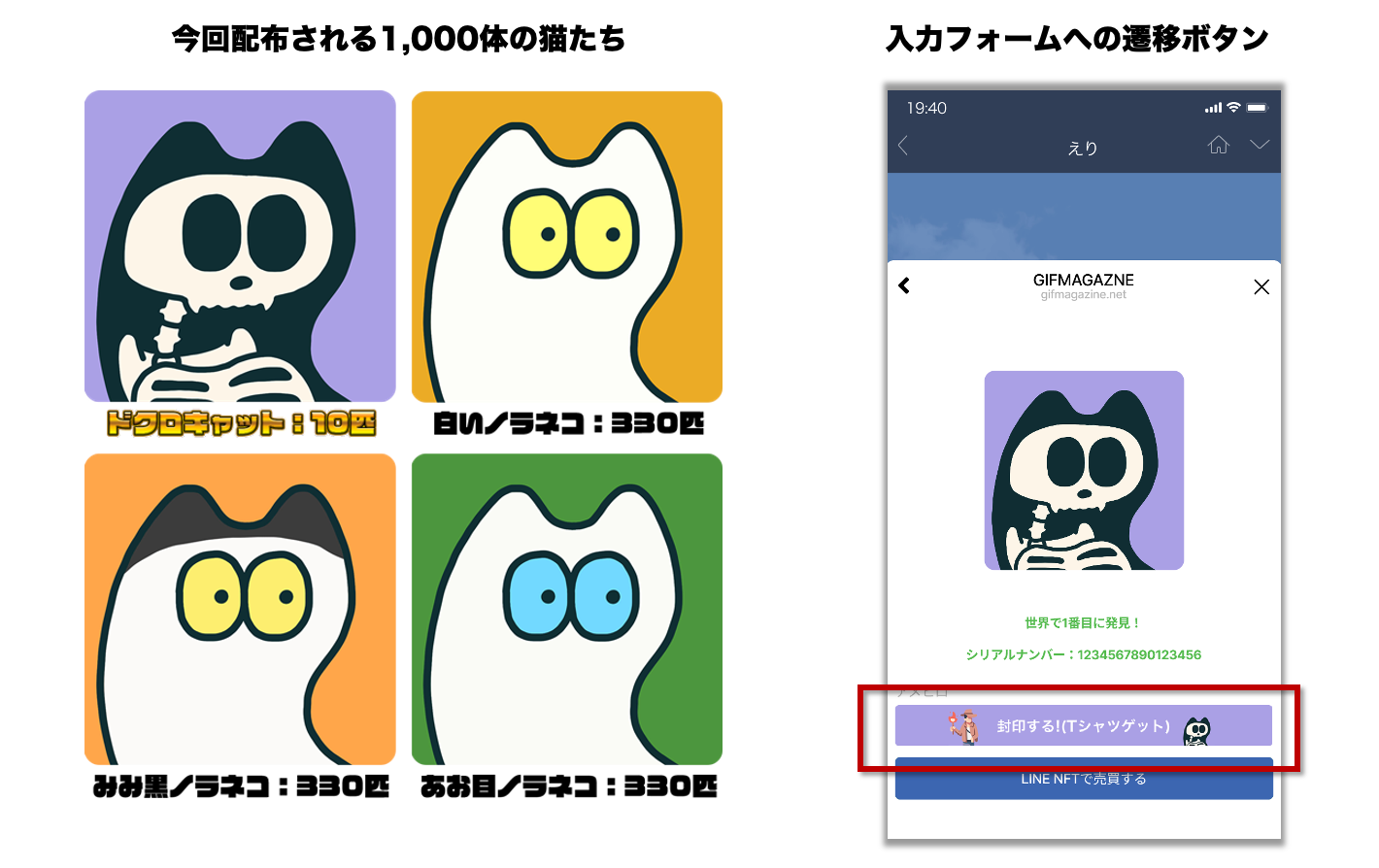 具体的には、先着で無料配布する1,000体の猫NFTのうち、グッズ付きNFTのドクロキャットが10体存在します。それを抽選で得た当選者は、NFT詳細ページ下部にある「封印する(Tシャツゲット)」ボタンをタップすることで景品受取りの申込を行うことができます。Tシャツの製造、及び、発送等の業務をCDGに担当いただき、共同でキャンペーンを展開し、今後のサービス拡販を目指していきます。