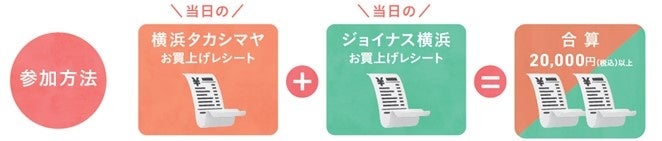 【ご参加方法】横浜タカシマヤ・ジョイナス横浜の2施設にて、当日のお買い上げレシート合算20,000円(税込)ごとに、1回抽選にご参加いただけます。レシートの合算金額に応じて、お1人様最大5回までの参加が可能となります。