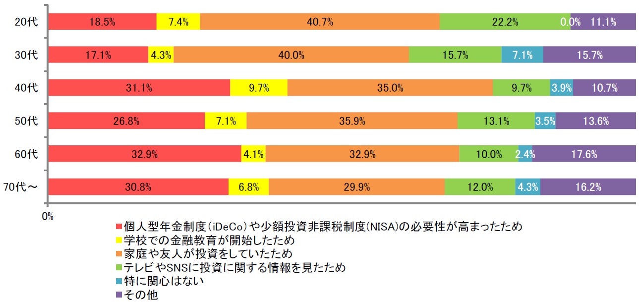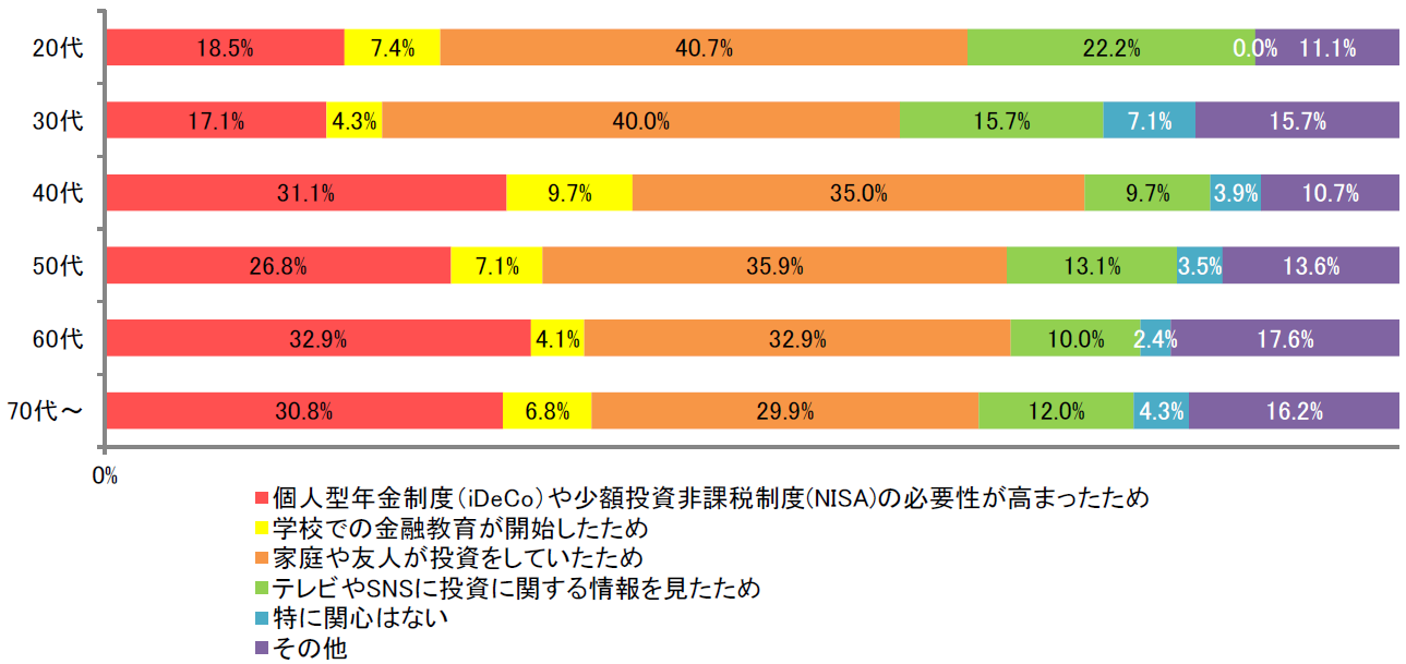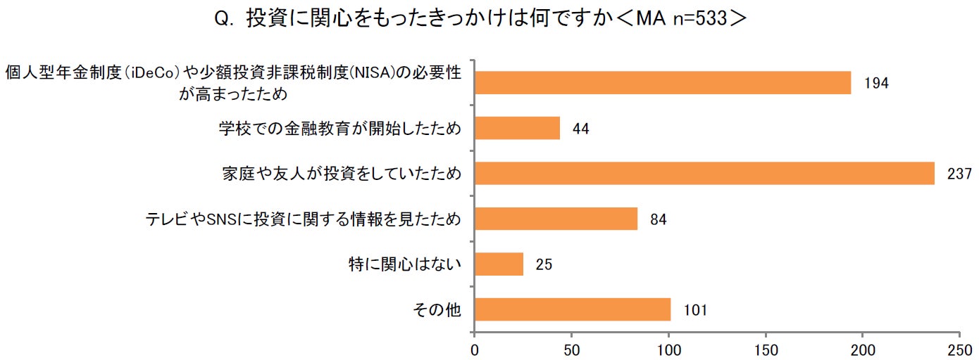 「投資に関心をもったきっかけは何ですか<MA>」という問では、「家庭や友人が投資をしていたため」(237)が4割以上と最も多くなりました。身近な人から投資の必要性を感じると共に、投資経験者がいる安心感が、投資への関心のきっかけになっていることが伺えます。また、「個人型年金制度(iDeCo)や少額投資非課税制度(NISA)の必要性が高まったため」(194)という回答も多く、20代30代が2割以下にとどまっているものの、40代以上は3割に増えていることから、お金に余裕が出てくるほど個人で管理する年金制度への関心が高いことがわかります。