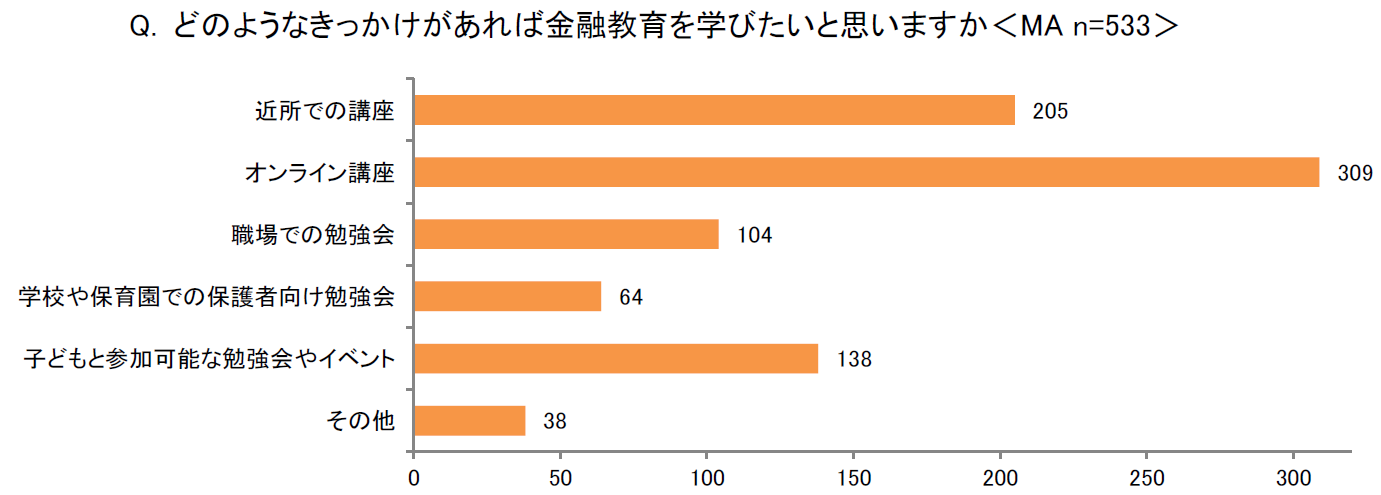 「どのようなきっかけがあれば金融教育を学びたいと思いますか<MA>」の問では、半数以上が「オンライン講座」(309)と回答し、また第2位に「近所での講座」(205)が続き、通いやすい環境で学べる金融教育を希望していることがわかりました。さらに、「大人への金融教育や投資教育をどこに実施してほしいと思いますか<MA>」では、4割以上が「社会人向けの習い事」(245)、「子どもが通う学校」(239)と回答をしており、金融教育を受ける適切な場所がわからない中で、子どもたちと同じように学校や習い事を通じて学べることに安心感があることが伺えます。