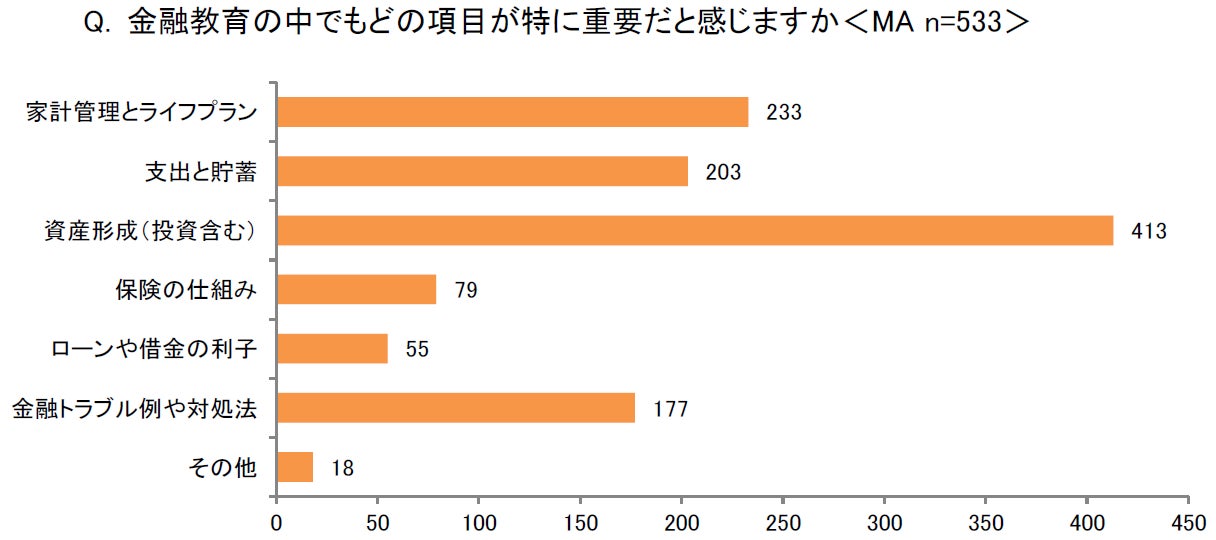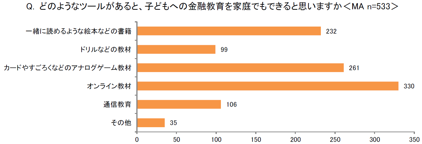 「どのようなツールがあると、子どもへの金融教育を家庭でもできると思いますか<MA>」の問では、「オンライン教材」(330)が6割以上となり、コロナ禍でのオンライン化の浸透で、家にいながら学べる環境を求めていることがわかります。さらに第2位には「カードやすごろくなどのアナログゲーム教材」(261)、第3位には「一緒に読めるような絵本などの書籍」(232)が続いており、遊びを通じて自然に学べる教材や親子で一緒に学べる教材に関心が高まっていることが伺えます。