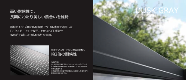 ダスクグレー色は、薄暮の時間帯をコンセプトにしたごくわずかに青みを感じる低彩度のカラーで、住宅に美しく馴染みます。形材のトップ層に高耐候型アクリル塗料を適用したテクスガードを採用することで、テクスガードなし製品と比較し約2倍の高い耐候性で長期に渡り美しい風合いを維持します。